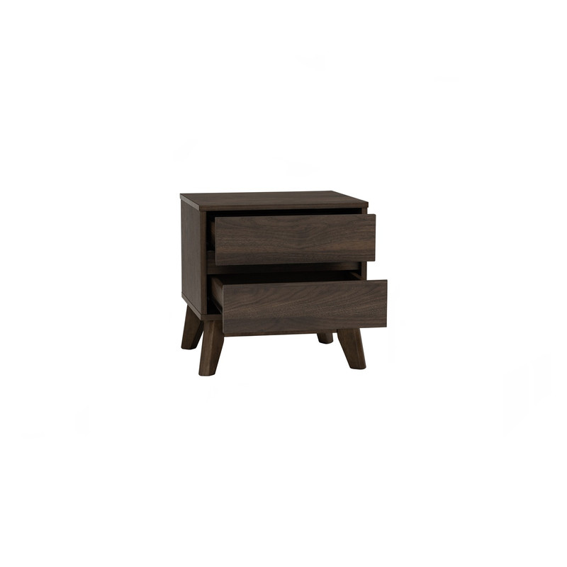 This bedside table features a stylish design with a cocoa-colored leg and a walnut-colored top, making it a versatile addition to any bedroom. Its compact size and elegant appearance provide both functionality and aesthetic appeal.