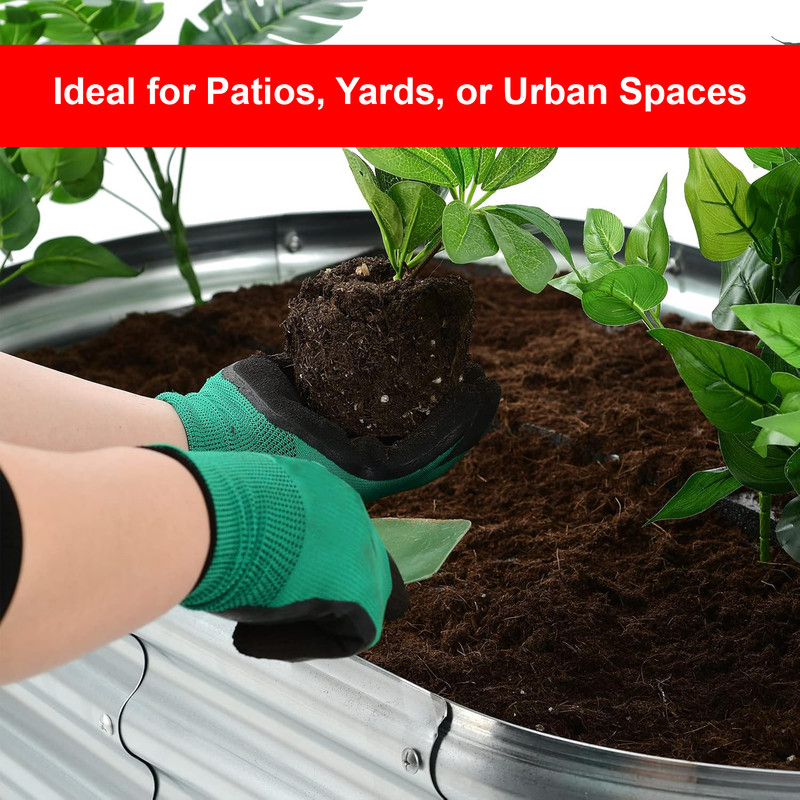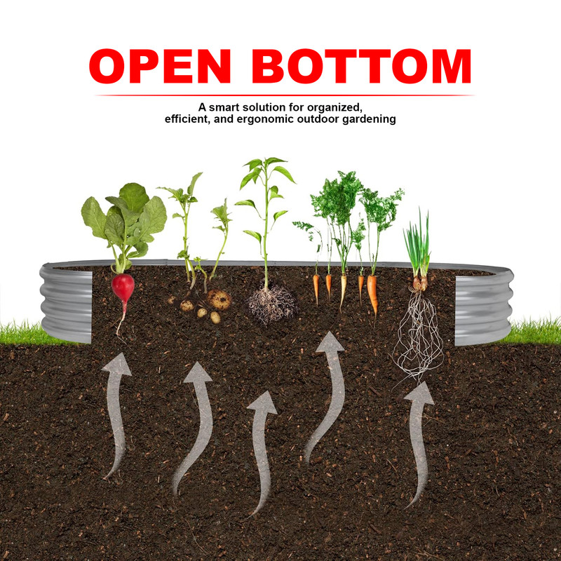 This raised garden bed is designed for outdoor gardening in various spaces such as yards, patios, balconies, or greenhouses. Made from galvanized steel, it offers durability, ease of assembly, and customization options. The open base promotes natural drainage and healthy root growth, making it suitable for growing vegetables, herbs, or flowers. Its sleek silver finish adds a modern touch to any outdoor environment.