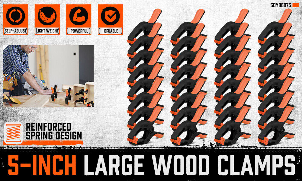 This set includes multiple heavy-duty clamps designed for various professional and DIY applications. Made from reinforced glass fiber nylon, these clamps feature an ergonomic handle with a double TPR grip for comfortable use. The tempered steel coil spring provides strong clamping force, ensuring secure grip on objects. The wide rotary jaw adjusts automatically to uneven surfaces, offering stable and protective clamping for different work surfaces.