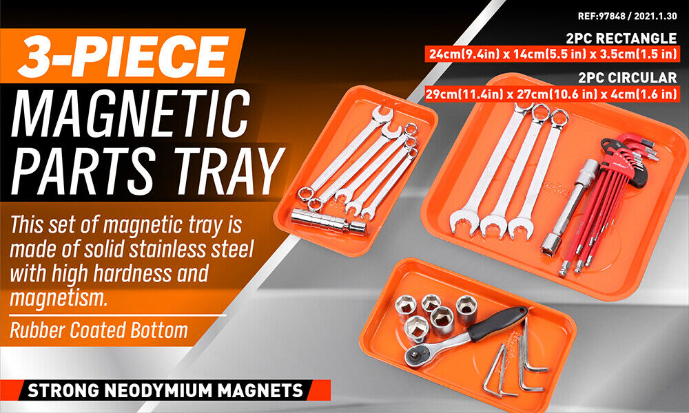 This magnetic parts tray set is designed for organizing small hardware and tools efficiently. Made from durable stainless steel, these trays provide strong magnetic hold and reliable performance in various work environments. The rubber-coated bottoms prevent slipping and protect surfaces, making them suitable for use on different surfaces and in different positions.