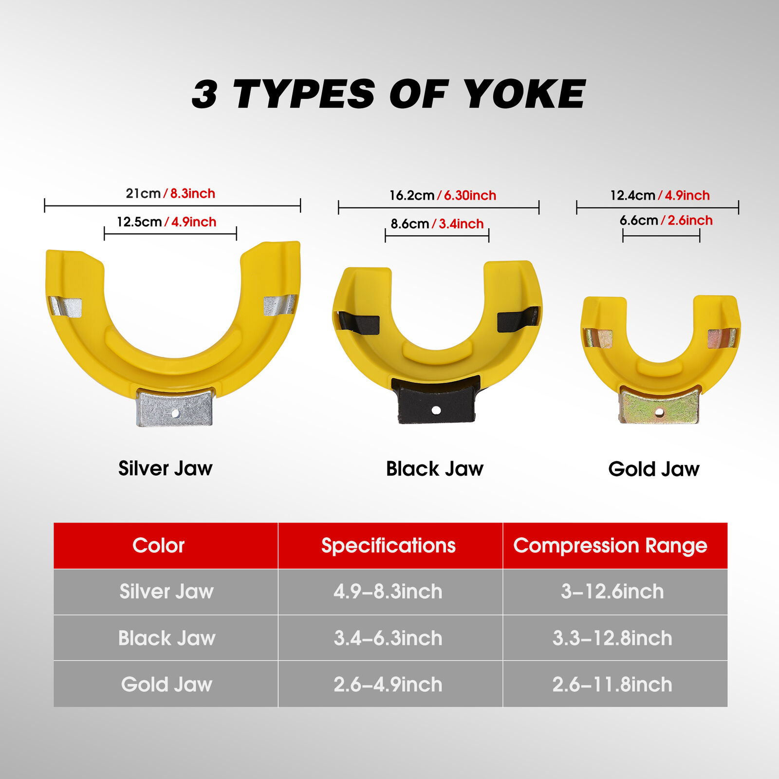 - Three interchangeable yokes are included to accommodate various vehicle models: a yoke for spring diameters from 2.6 to 4.9 inches, a yoke for 3.4 to 6.3 inches, and a yoke for 4.9 to 8.3 inches, with respective compression ranges from 2.6 to 11.8 inches, 3.3 to 12.8 inches, and 3 to 12.6 inches.