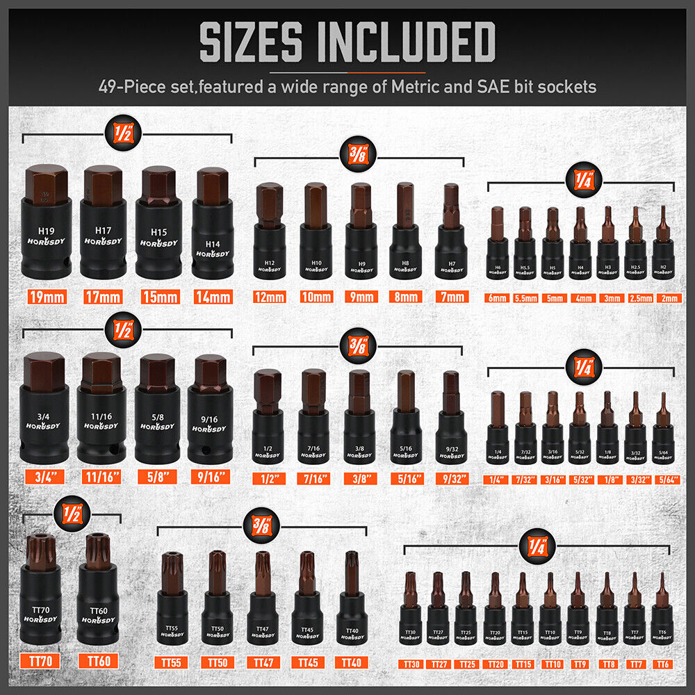 - Includes a wide range of Torx, star, and hex socket bits in both metric and SAE sizes