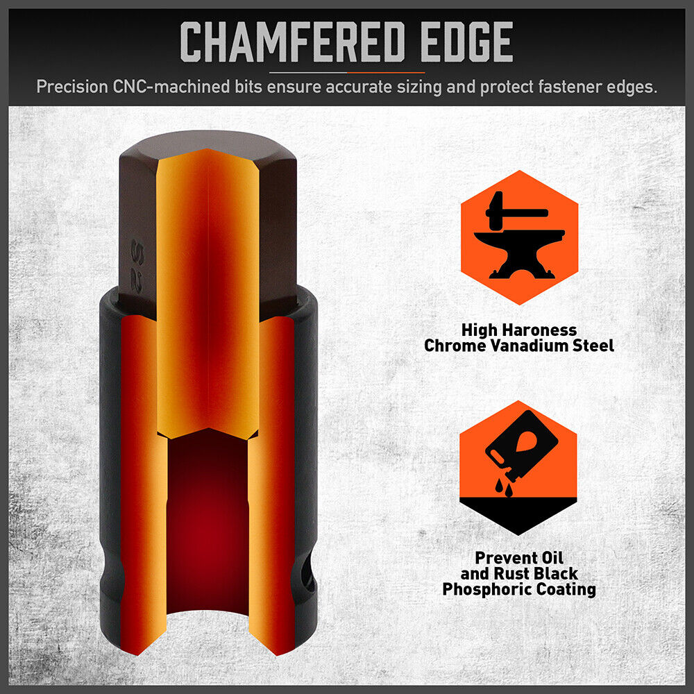 - 16 SAE hex socket bits in various sizes for 1/4″, 3/8″, and 1/2″ drives