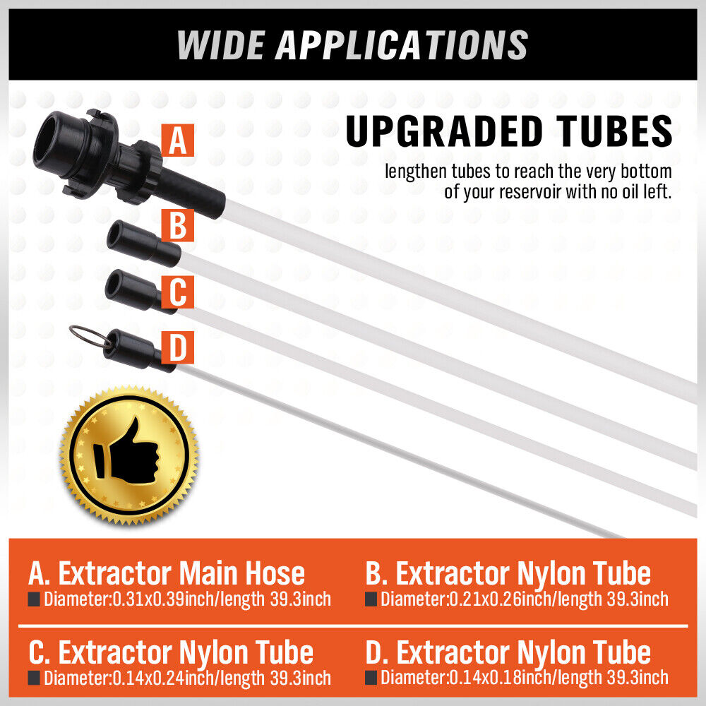- Ideal for extracting engine oil, gear oil, coolant, power steering fluid, and brake fluid from vehicles, marine engines, stationary engines, and industrial equipment.