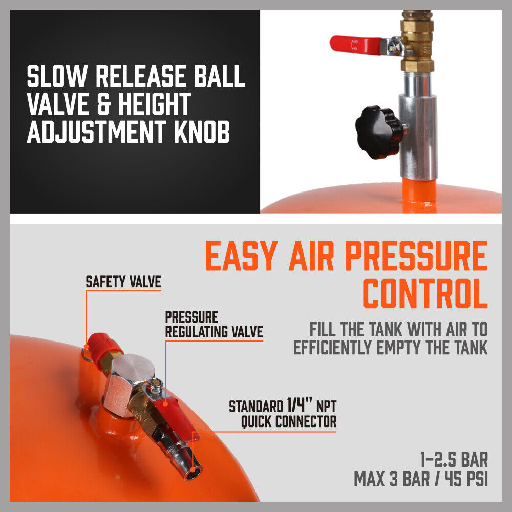 - Oil Drain Tank Working Pressure: Max 45psi. Air Inlet: Standard NPT. Suitable for extracting waste oil and fluids from vehicles.