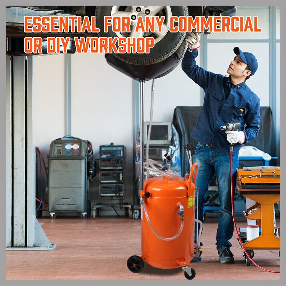 This waste oil drainer features a large capacity and a multi-function design, making it suitable for various workshop applications. Its rugged powder-coated tank ensures durability and long-term use, while the pneumatic system allows for efficient fluid collection and extraction.