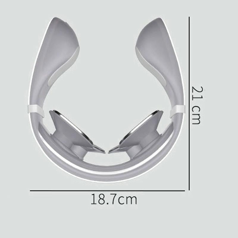 Specifications include a USB charging power supply, a battery capacity of 600 mAh, and dimensions of 18.7 x 21 cm. The device is made of silicone and is designed specifically for neck therapy, utilizing TENS pulse technology for effective physiotherapy.