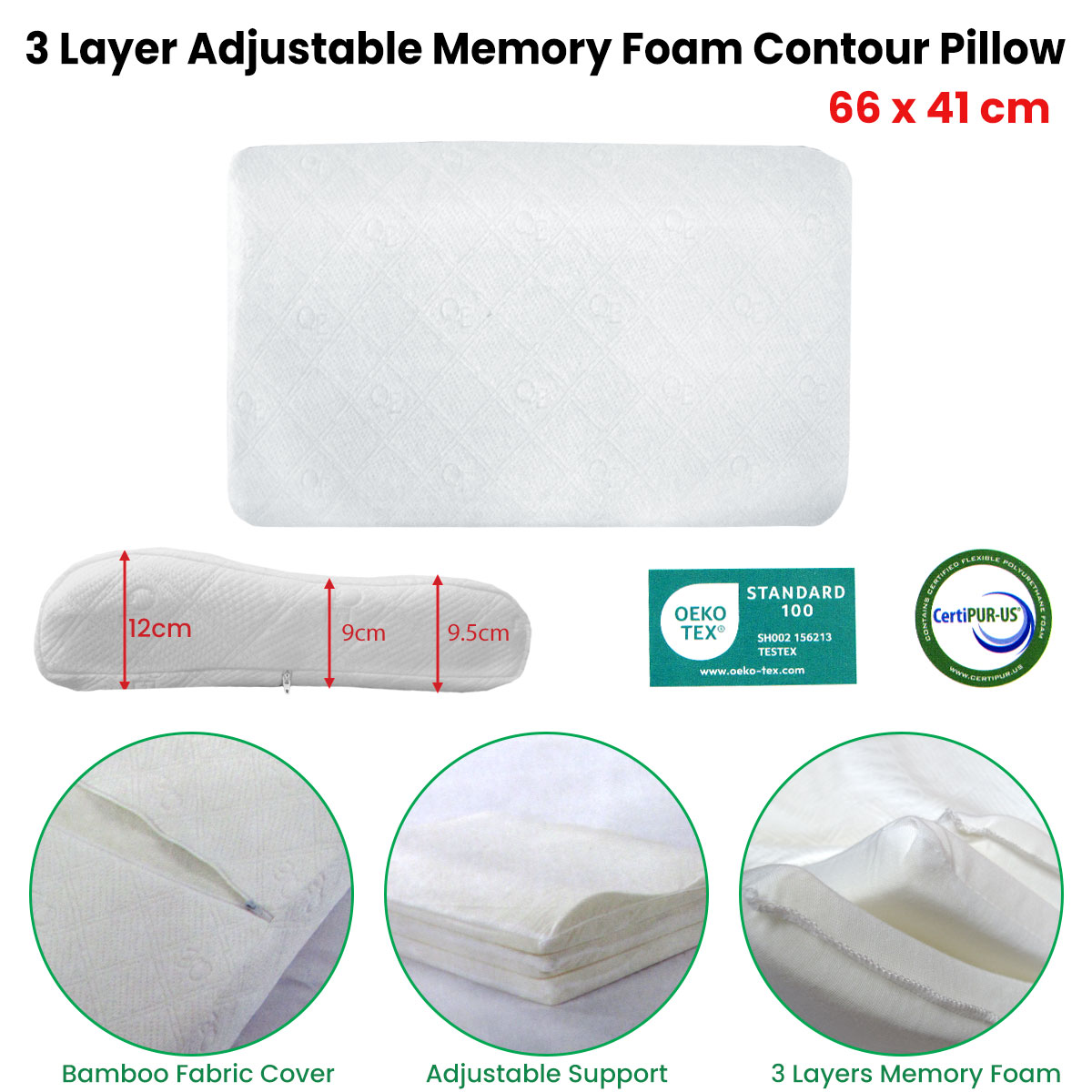 The adjustable 3-layer memory foam contour pillow offers customizable comfort and support for a restful sleep. Its layered design allows you to modify the height and firmness to match your sleeping preferences. Made with eco-friendly certifications, it provides a safe and comfortable sleeping experience every night.