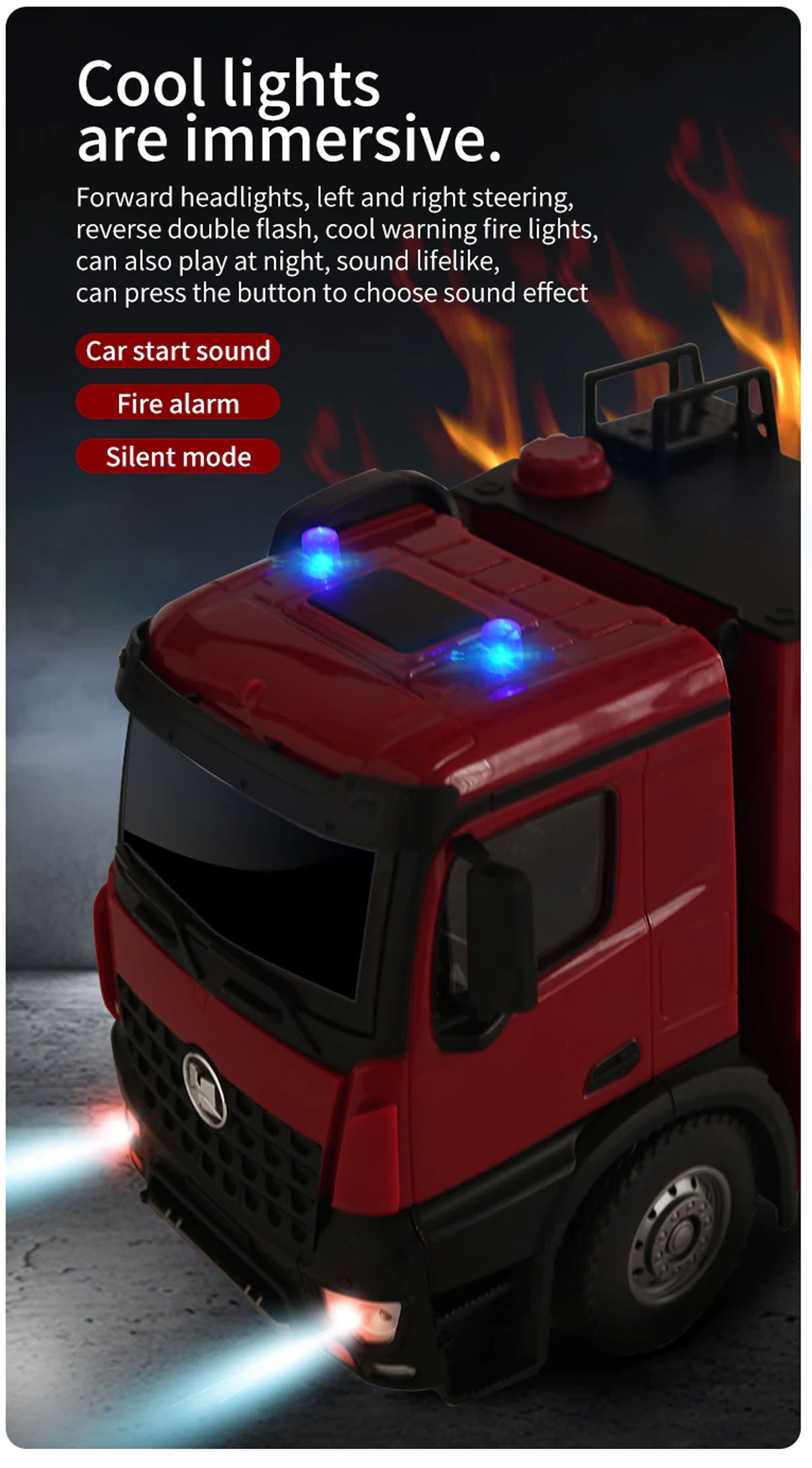 This 1:14 scale RC fire truck features an extensible ladder, water spray function, simulated fire alarm sounds, and lighting effects. It is designed with safety in mind, made from non-toxic plastic, and offers a variety of functions that enhance play and development skills. The toy is suitable for children and makes an excellent gift for occasions such as birthdays and holidays.