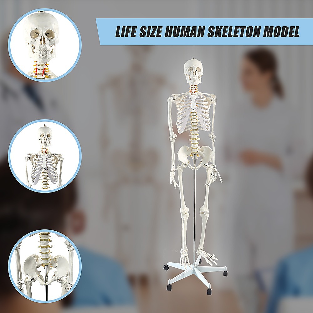 This life-sized human skeleton model provides an accurate and detailed representation of the adult human skeletal system. It is suitable for educational purposes, professional training, and artistic study, offering a realistic look and feel with movable and removable parts for close examination.