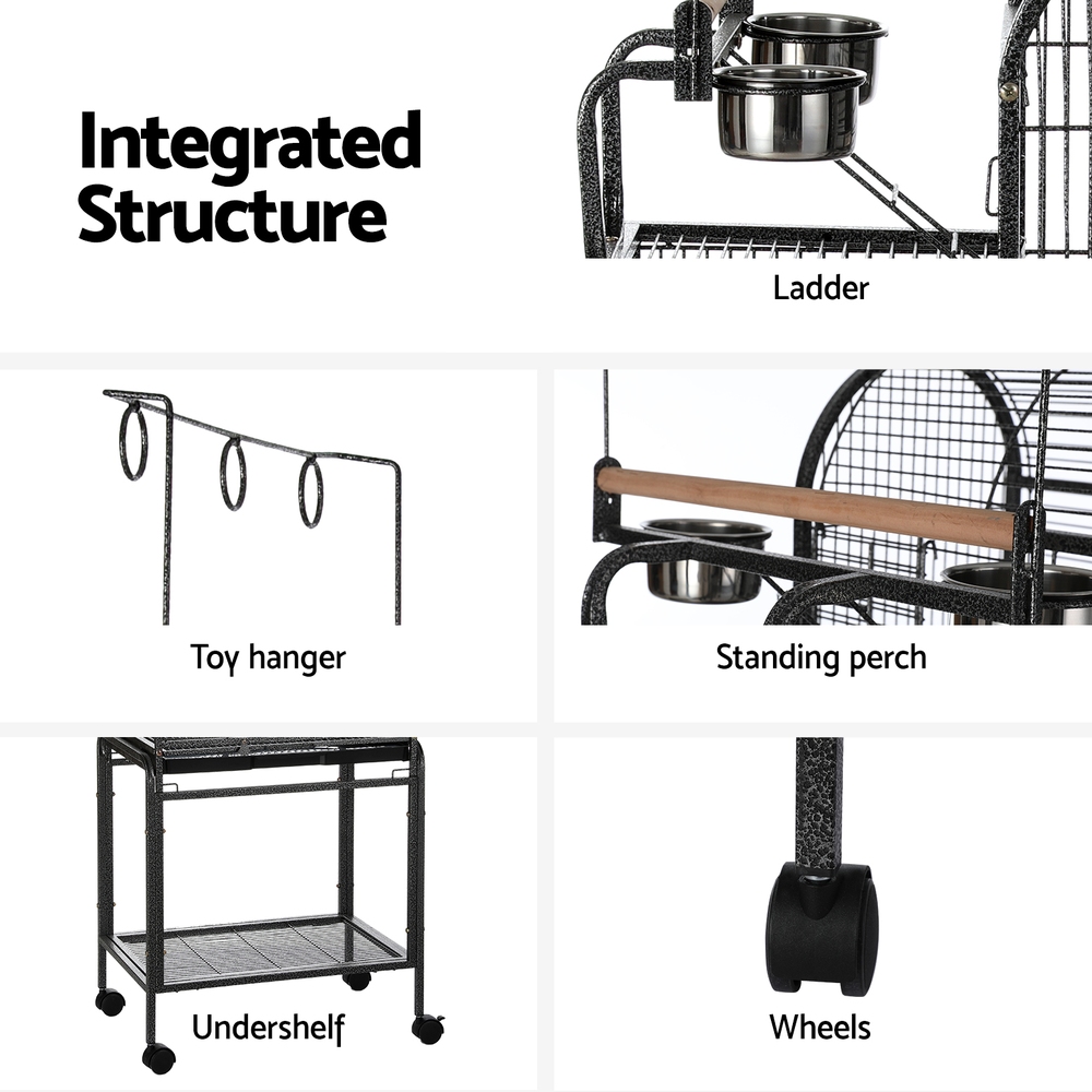 • Integrated structure with a climbing ladder, toy hanger, wooden perches, feeders, and an undershelf