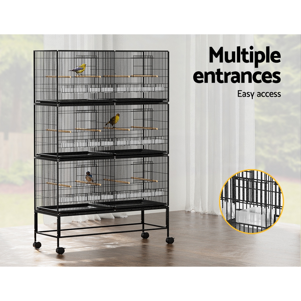 This large bird cage provides a comprehensive environment for small birds to live, breed, and thrive. Its expandable six-cage design features multiple nesting boxes and food and water bowls, facilitating sharing and social interaction. Constructed from durable powder-coated iron with a galvanized finish, the cage is resistant to rust and corrosion. It includes numerous perches to keep birds entertained and healthy, along with slide-out dividers and trays for easy customization and cleaning. The cage is supported by a detachable stand with castor wheels for easy mobility and is simple to assemble without screws, following a straightforward guide.