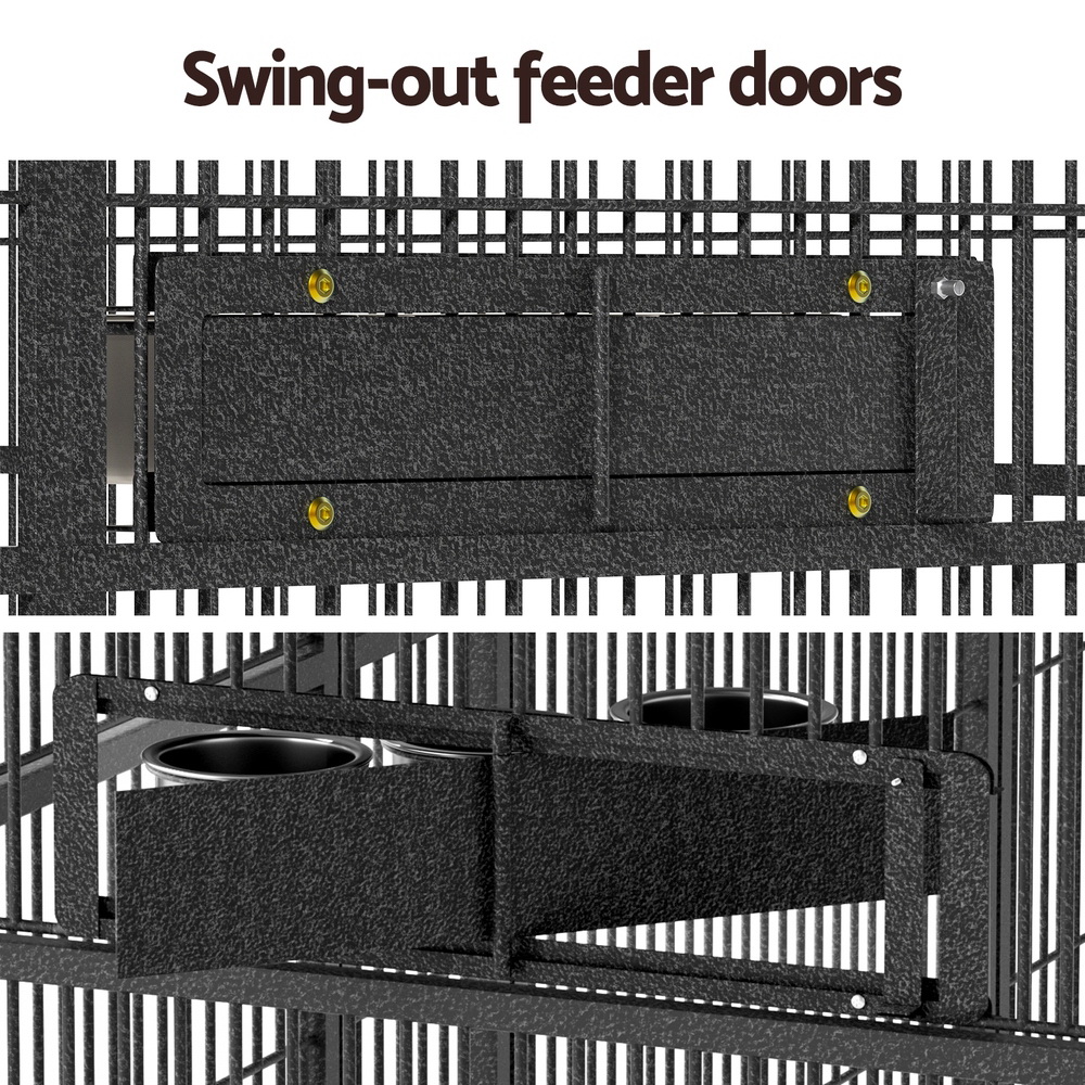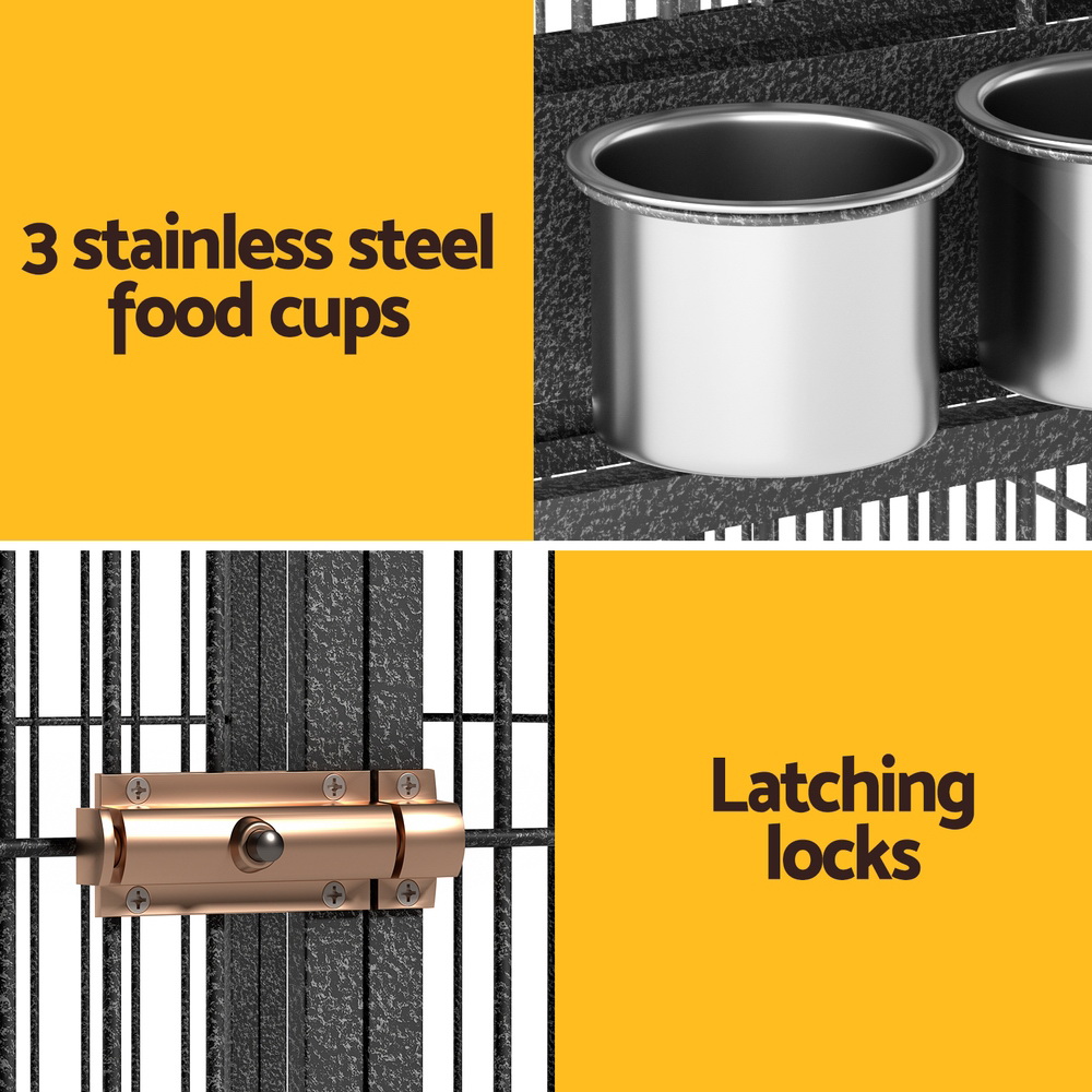 This large walk-in aviary provides ample space for large birds, reptiles, or small pets to move freely and stay comfortable. Made from durable wrought iron with a protective coating, it offers long-lasting use and resistance to rust and corrosion. The cage features a large walk-in door for easy access and cleaning, swing-out feeder doors, and three stainless steel food cups for convenient feeding. Secure latched locks ensure your pets remain safe inside the cage.