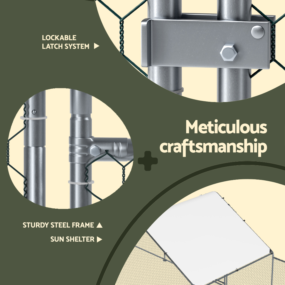 This large pet enclosure provides a safe and comfortable space for chickens, ducks, and geese to rest, sleep, and relax. It features a spacious interior that allows pets to move freely, ensuring they do not feel confined. The structure is made from durable galvanised steel with wire sidewalls for proper airflow and ventilation. The weather-resistant roof offers protection during harsh weather conditions, making it suitable for outdoor use.