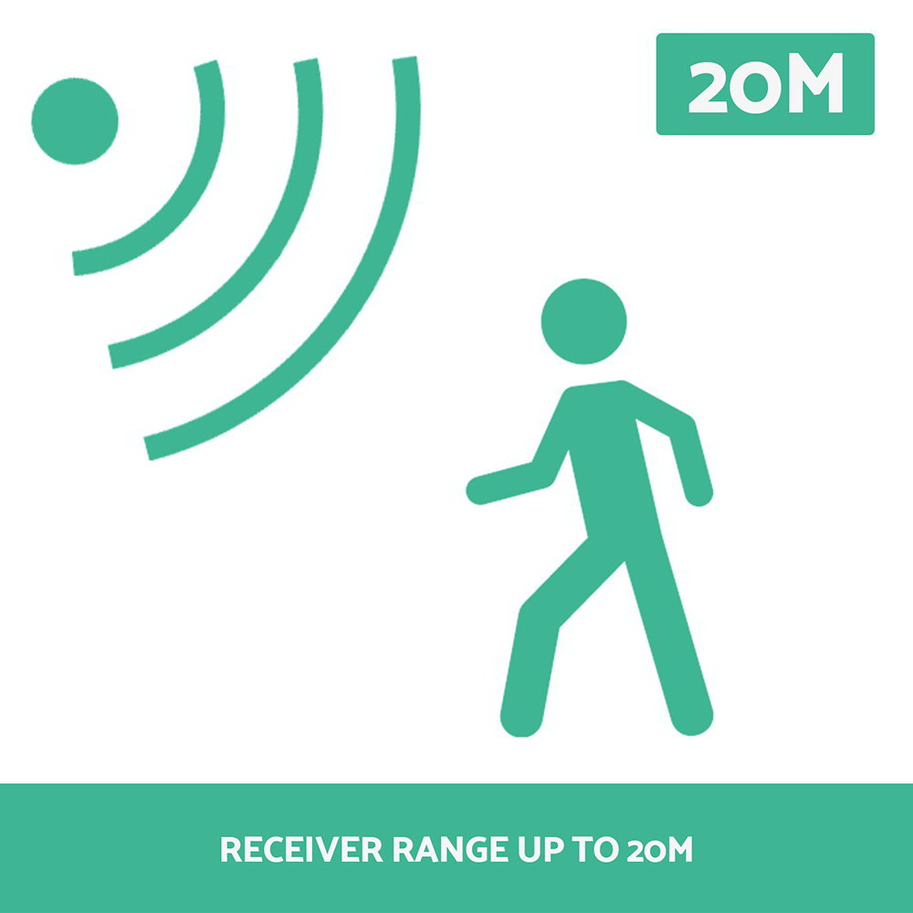 • Receiver range: Up to 20 meters, reduced by 30% in bad weather