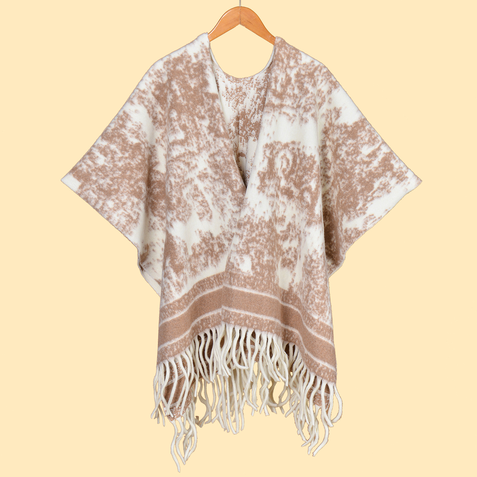 This elegant autumn and winter shawl combines style and warmth with a unique artistic design. Made from a soft blend of acrylic and polyester, it offers a cozy feel suitable for various occasions. Its lightweight construction and distinctive split-front style make it a versatile outer layer for travel, casual outings, or special events.