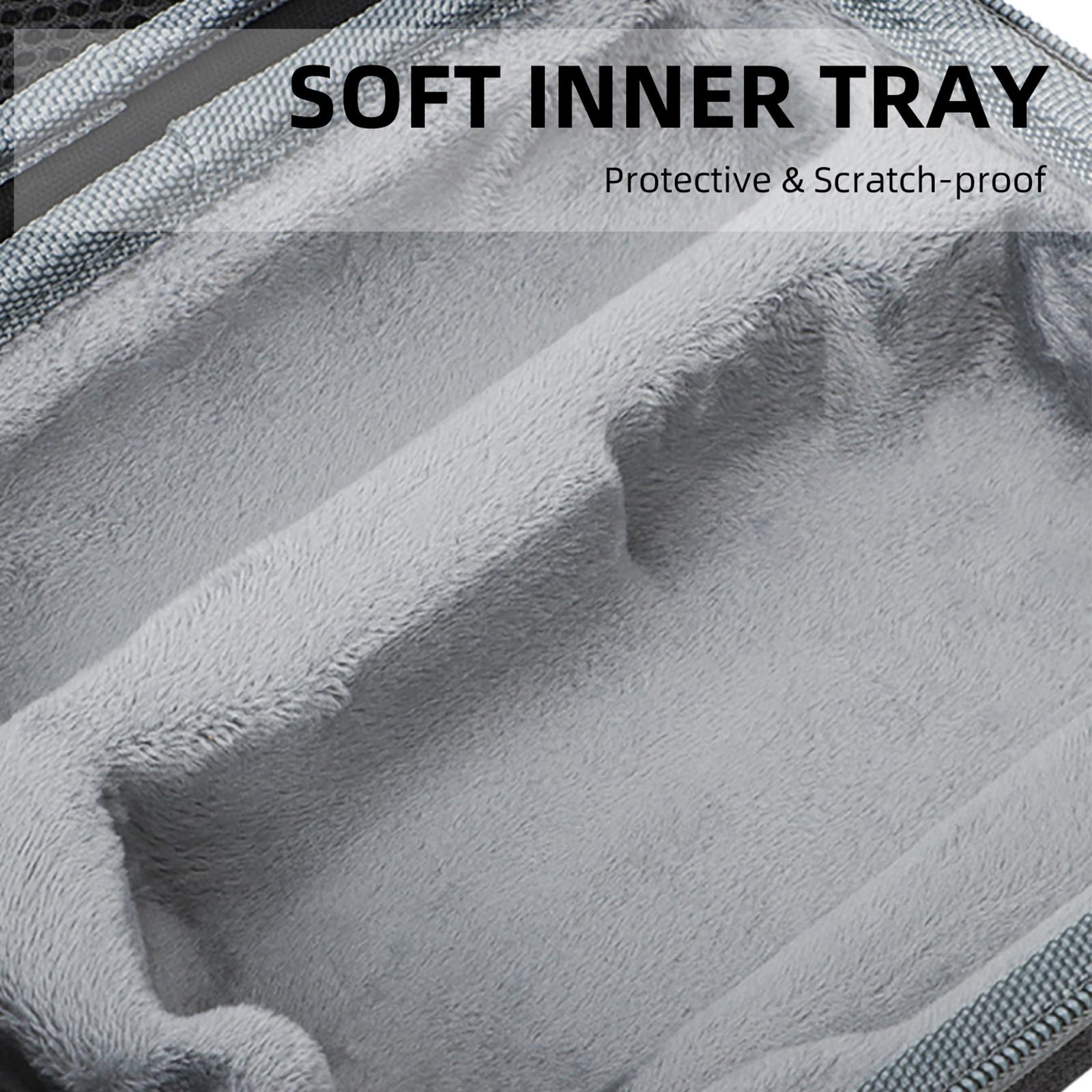 This portable storage bag is designed to securely hold and protect your Insta360 Flow device along with accessories such as tripods, mobile phone clips, fill lights, data cables, and other small items. It features a durable hard shell exterior combined with a soft suede interior to provide comprehensive protection against scratches, shocks, and pressure. The compact design includes a convenient handle for easy carrying, making it suitable for travel and on-the-go use. Crafted from high-quality fabric material, this storage bag offers both durability and practicality.