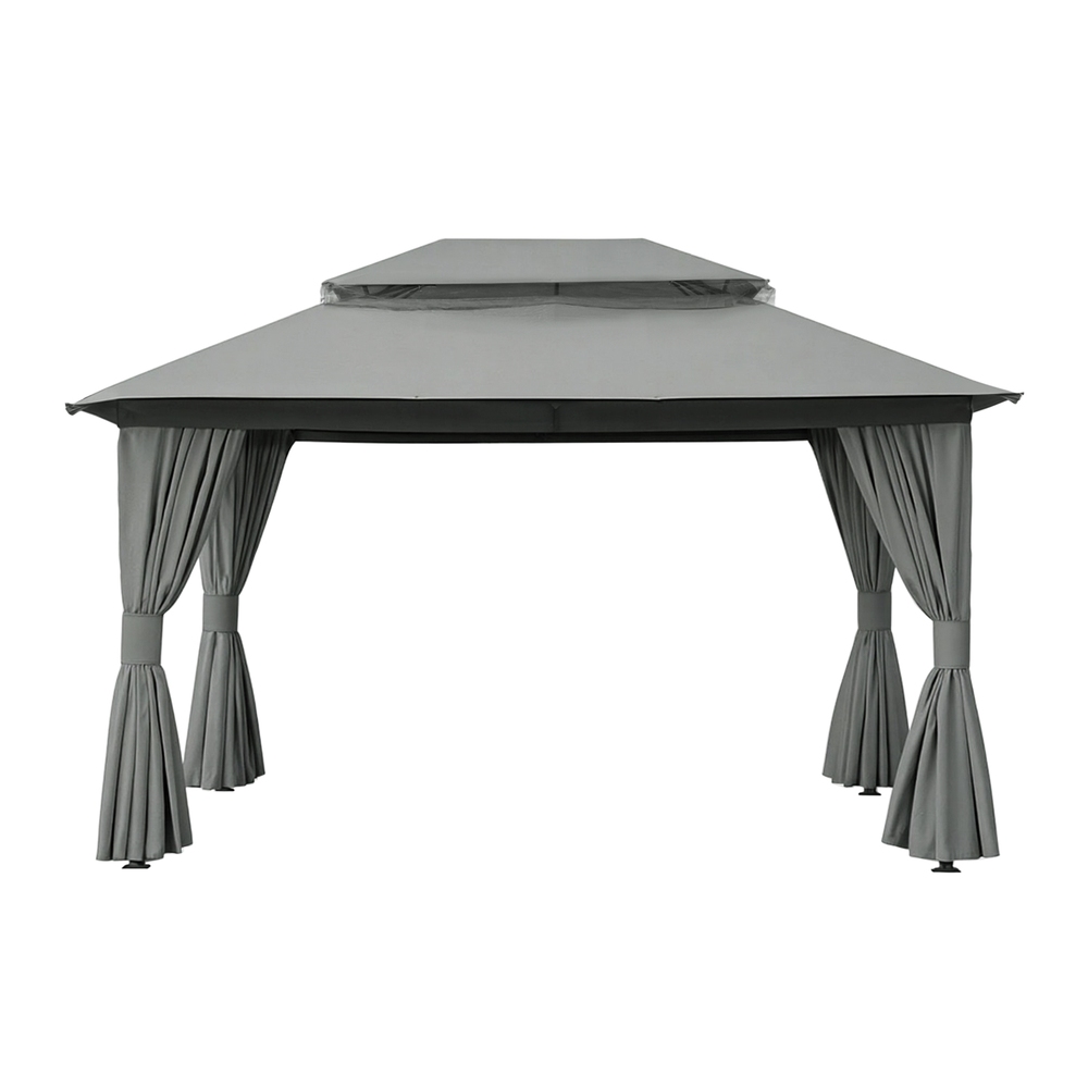 This outdoor gazebo provides a comfortable and protected space for year-round use. It features a ventilated double-roof design that promotes airflow and shields from the sun and light rain with a UV-resistant, water-resistant top. The structure includes practical water leakage holes to prevent pooling and mosquito-proof mesh walls for insect protection. The design allows for easy setup and versatile use with removable curtains, hanging hooks, and hook & loop attachments. Constructed from durable steel and polyester, it offers stability and longevity.