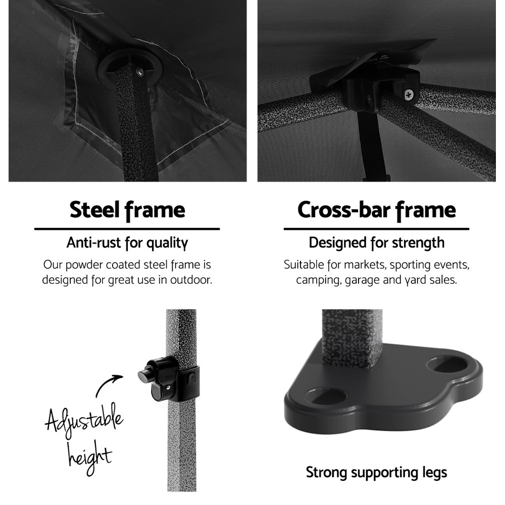 This pop-up gazebo offers a spacious ground and canopy coverage, making it suitable for various outdoor activities. It features a durable steel frame, adjustable height settings, and a water-resistant fabric cover, providing reliable shelter and sunshade. Easy to set up and transport, it is ideal for markets, events, camping, and outdoor gatherings.