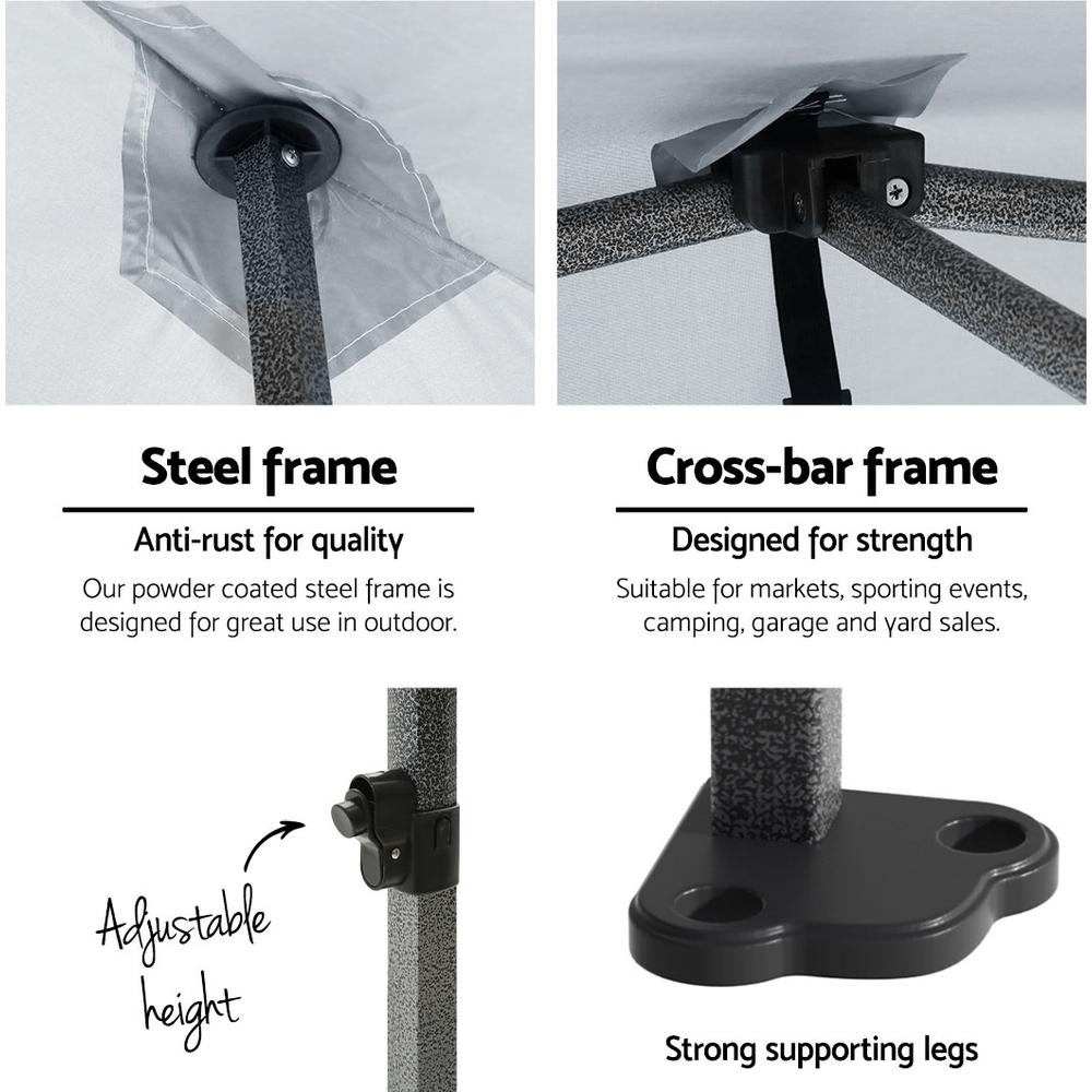This portable pop-up gazebo is designed for outdoor events, providing reliable shelter and shade in various weather conditions. Its versatile configuration options and sturdy construction make it suitable for markets, sports events, camping, yard sales, school functions, and trade shows.