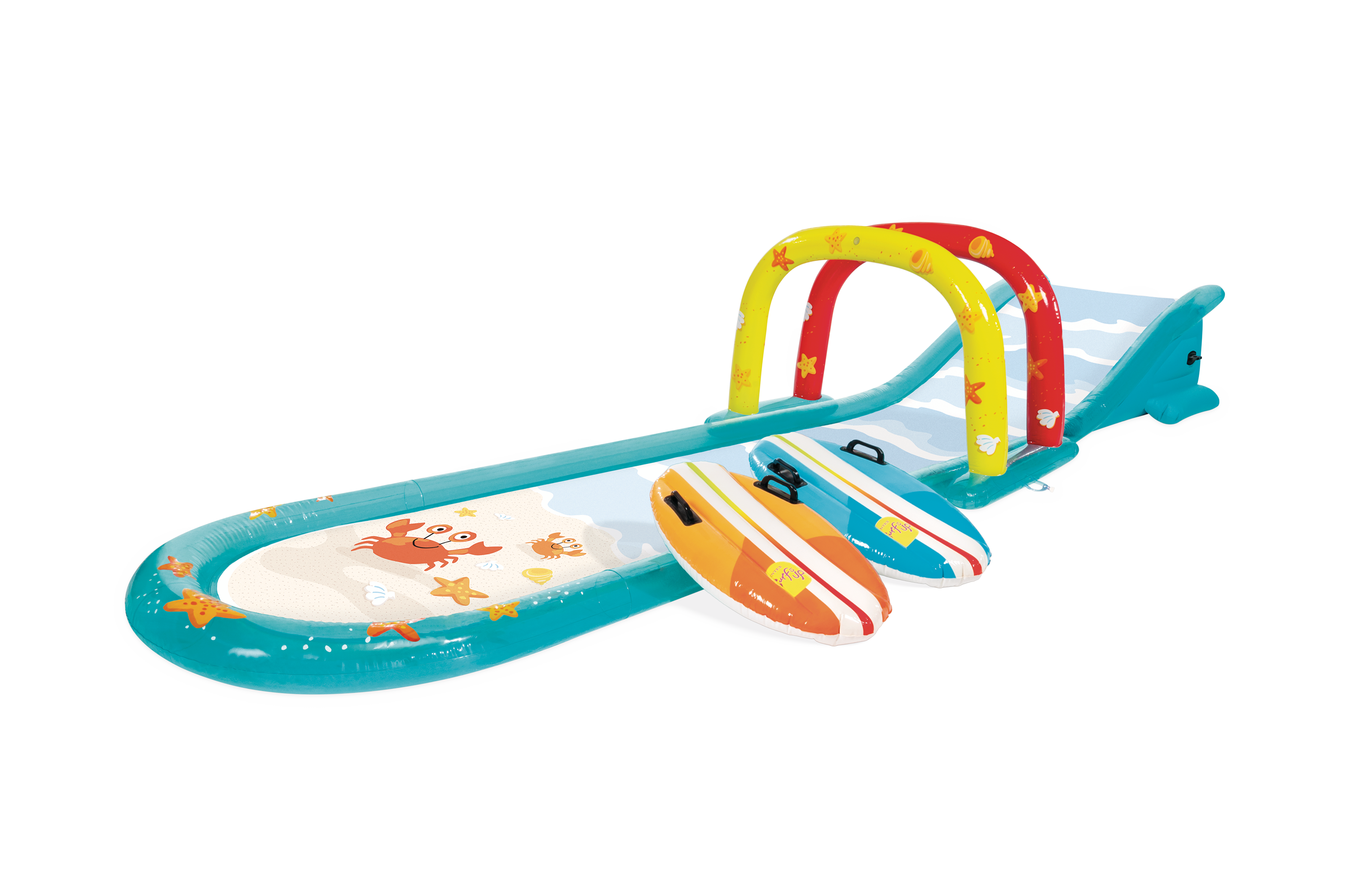 This inflatable slide provides a fun and refreshing experience for children in your backyard. Equipped with built-in sprayers connected to a garden hose, it offers a cool and exciting way for kids to enjoy water play. The set includes two inflatable surf riders with grab handles, making it easy for children to balance and have fun. Designed with handles on each side of the slide, it ensures a safe and easy launch for young users. The slide supports a maximum weight of 220 pounds, making it suitable for active play.