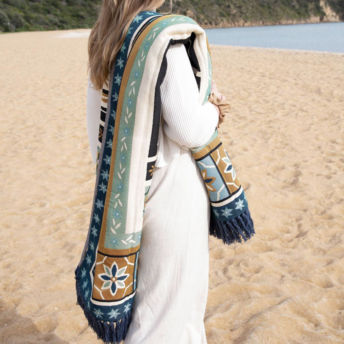 The Kasbah Luxury Fringe Throw is a versatile accessory suitable for various uses such as a throw, beach picnic rug, or wall hanging. Inspired by the vibrant streets and colors of Morocco, its bold design makes it a striking addition to any space. Made from a soft polyester cotton fabric, it combines comfort with style.