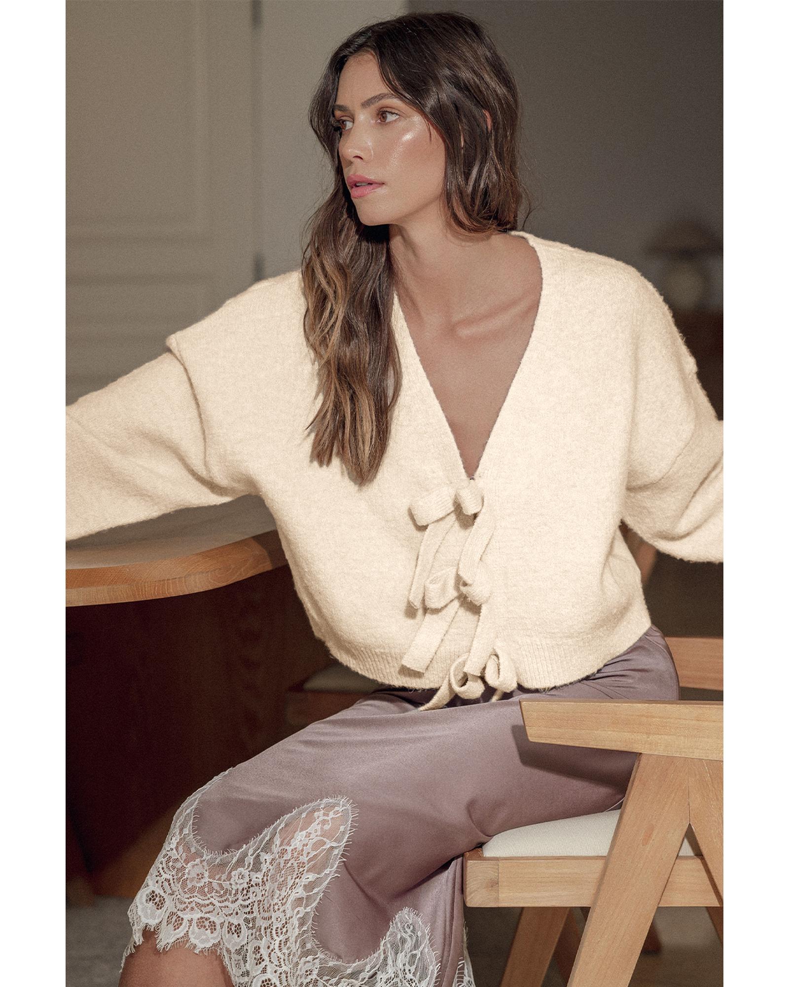 This knitted cardigan features a loose fit with a front bowknot detail and a V-neck design, making it a versatile and stylish layering piece. Its classic silhouette and feminine accents make it suitable for various occasions, whether paired with jeans or skirts. Crafted from a blend of premium fabrics, it offers warmth, comfort, and high elasticity for a comfortable fit.