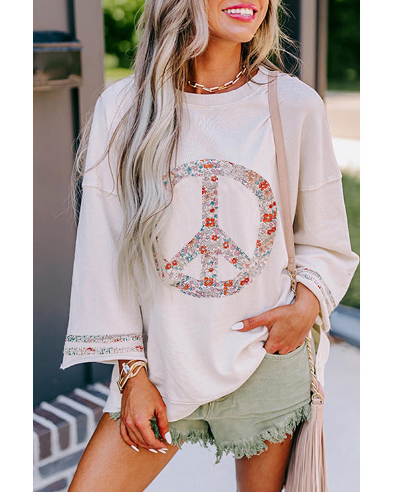 Jet Stream Floral Peace Sign Graphic Drop Shoulder Wide Sleeve Casual Top – M