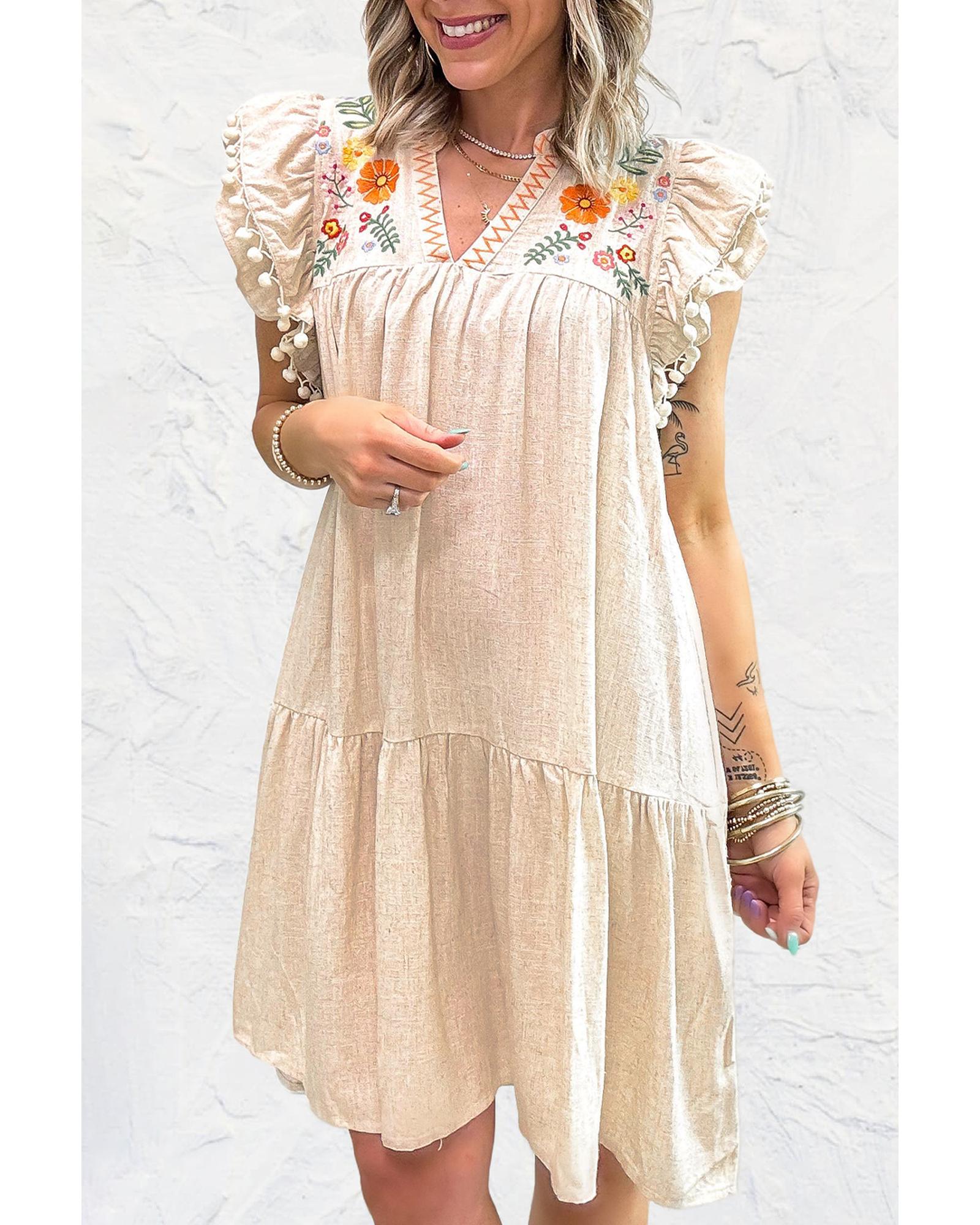This flowy short dress features delicate embroidery and charming ruffled sleeves with pom pom details. The split neck design and slight pleats contribute to a chic and graceful appearance, making it suitable for various occasions.