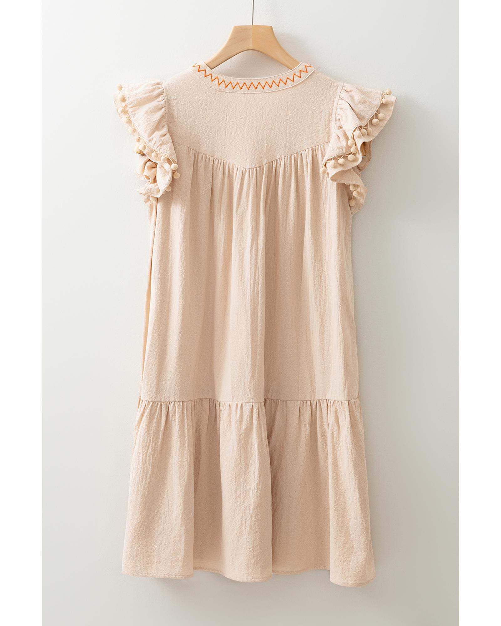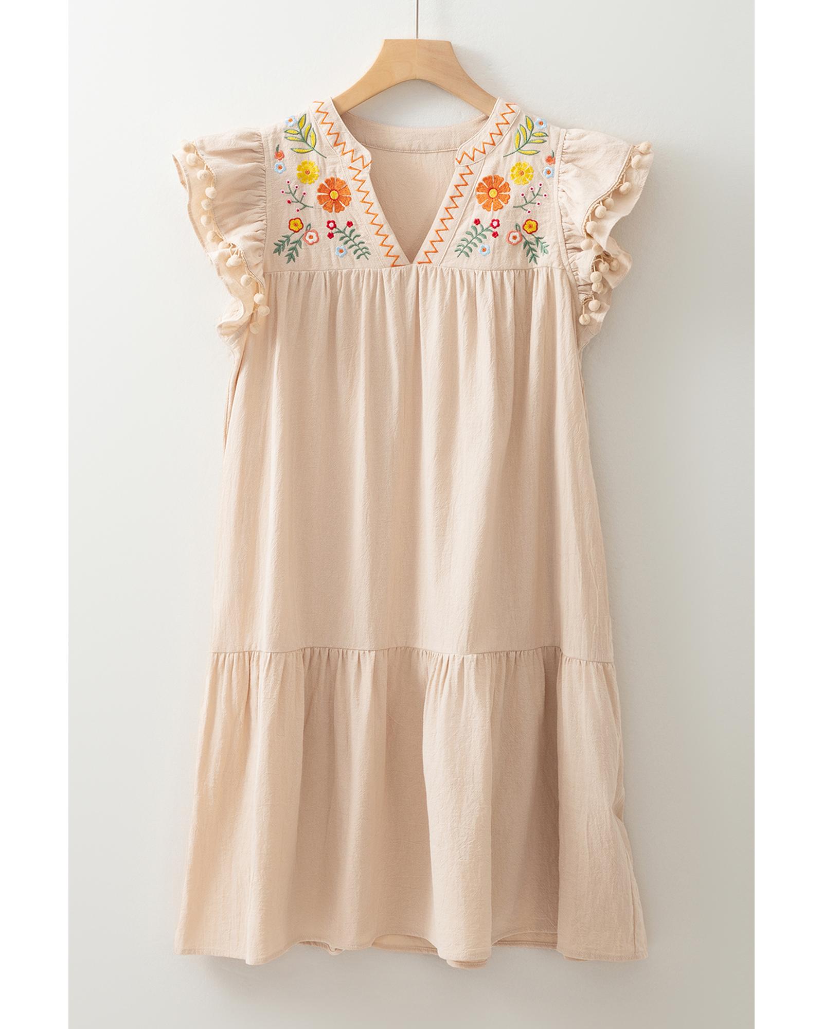 This flowy short dress features delicate embroidery and charming ruffled sleeves with pom pom details. The split neck design and slight pleats add a touch of elegance and grace, making it suitable for various occasions.