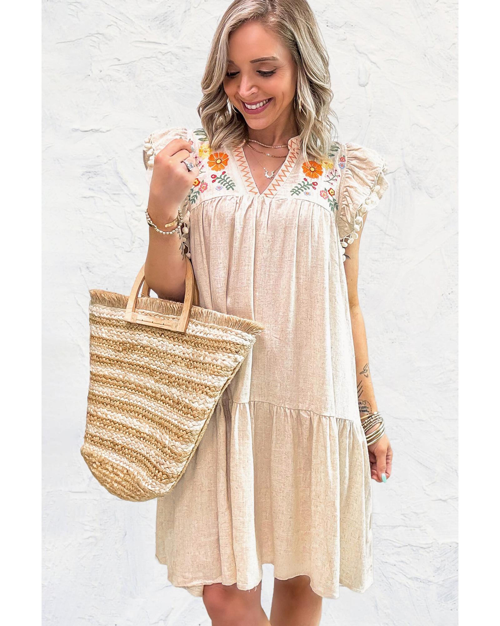 This flowy short dress features delicate embroidery and charming ruffled sleeves with pom pom details. Its split neck design and slightly pleated silhouette create a chic and graceful appearance, making it suitable for various occasions.