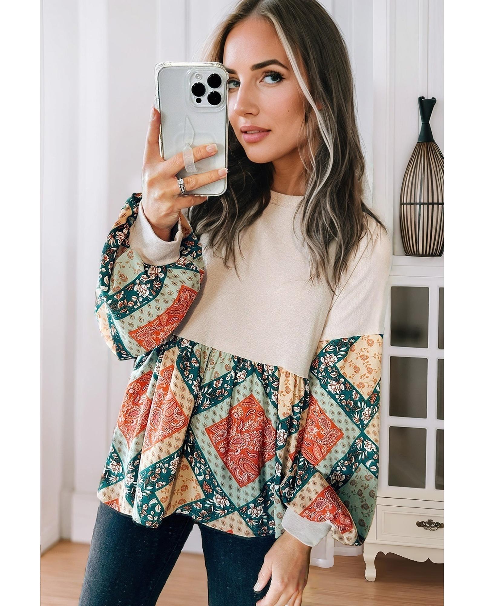 This stylish top features a unique paisley geometric patchwork design, perfect for adding a trendy touch to your wardrobe. With a comfortable crew neck and bubble sleeves, it offers a loose and flowy fit that is ideal for casual outings, especially during the fall and winter seasons.