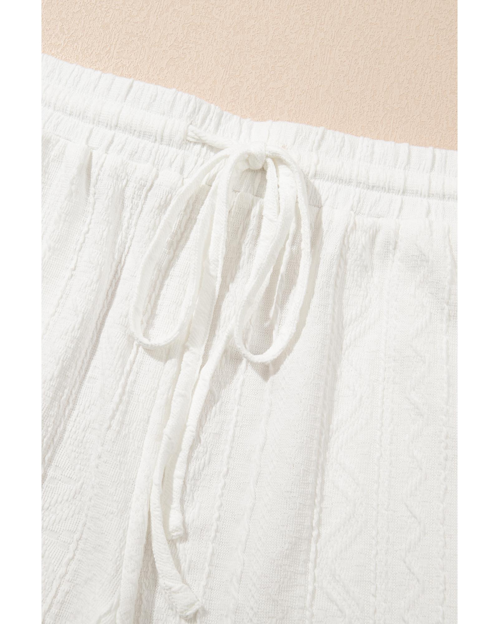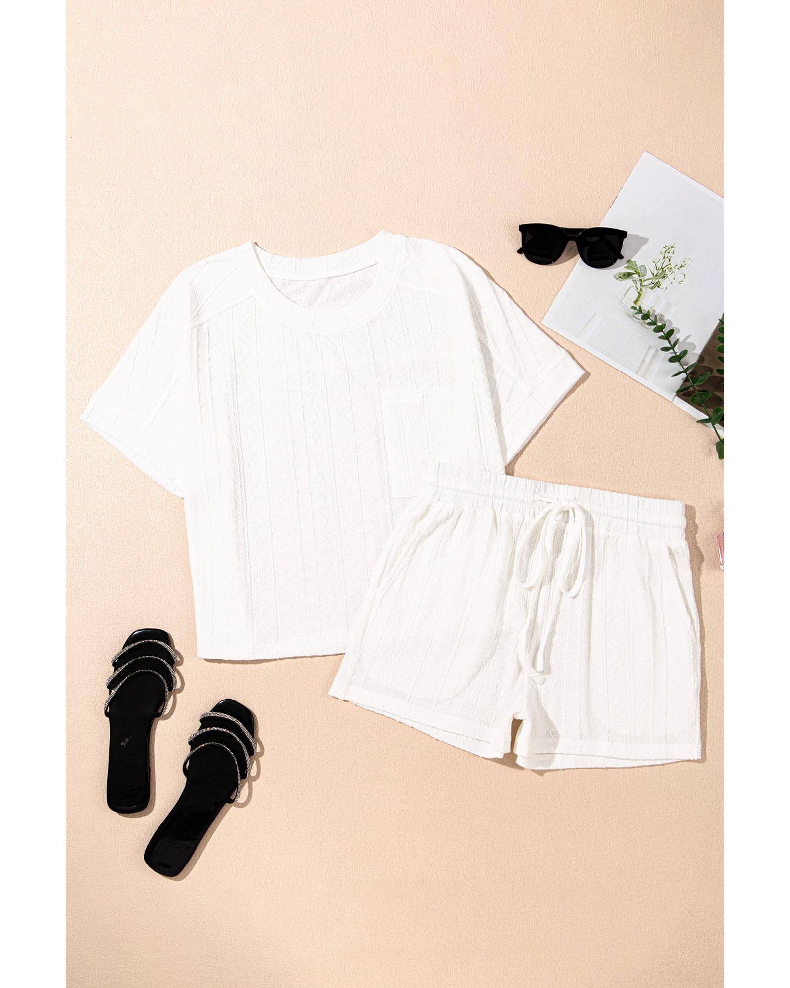 This stylish short sleeve top and drawstring shorts set features a textured fabric design, offering a trendy and fashionable look suitable for various occasions. The set includes a loose crew neck tee and casual shorts with a drawstring waist, making it versatile and comfortable for different body shapes.