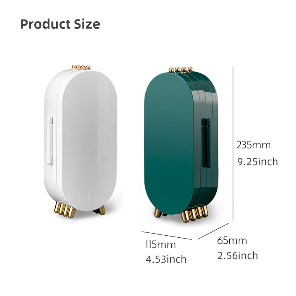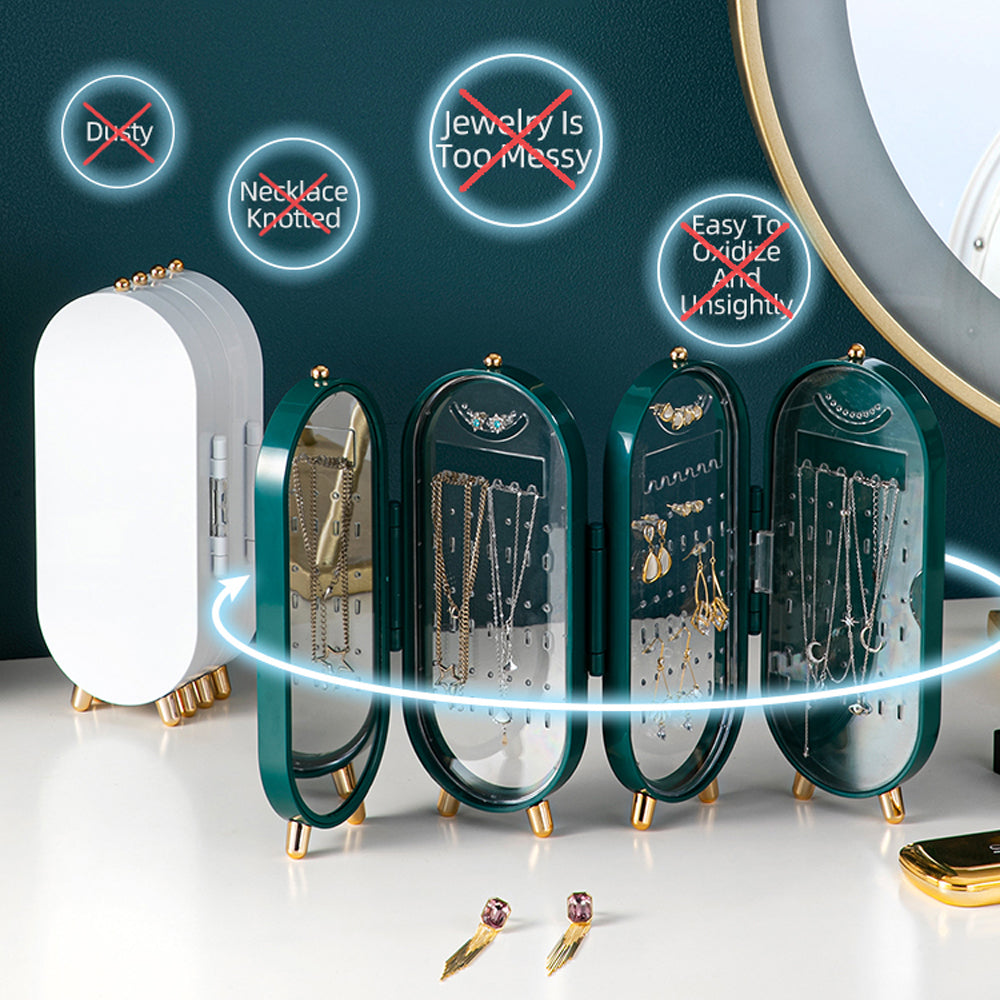 This jewelry storage box features a foldable design with four doors, providing an organized and space-saving solution for storing earrings, necklaces, and other jewelry items. It includes a mirror for convenient dressing and is suitable for use at home or in jewelry stores.