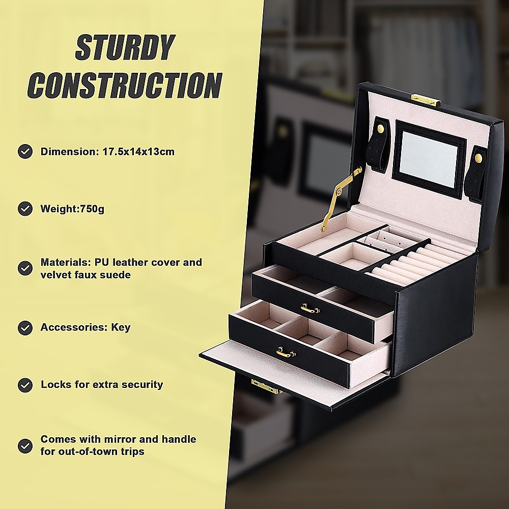This jewellery storage box offers an elegant and practical solution for organizing your finest jewelry pieces. Its sleek design features multiple compartments to keep earrings, necklaces, bracelets, and other accessories neatly separated, making it easy to find and access your items. Suitable for both travel and home use, it includes a mirror, a secure lock, and a handle for convenient carrying. The combination of a glossy exterior and soft interior provides both style and protection for your jewelry collection.
