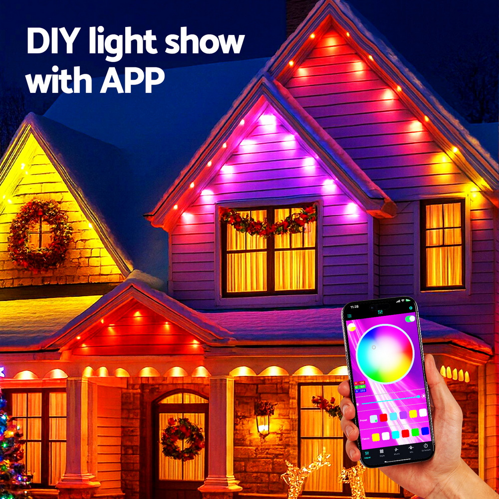 This string of Christmas lights is designed for permanent outdoor decoration, measuring 15 meters in length to suit most eaves. The lights are solar-powered, automatically illuminating in festive colors at night after absorbing sunlight during the day. They can be controlled via a mobile app, allowing users to select different lighting modes such as gentle twinkles or lively party effects. The included DIY clips enable easy installation around gutters and beams, and the waterproof construction ensures durability during adverse weather conditions.