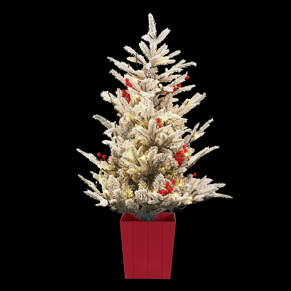 This festive holiday tree is a 1-meter tall potted decoration designed to add warmth and charm to your home. It features realistic flocked leaves, bright red berries, and warm white LED lights that create a cozy and inviting atmosphere. The sturdy bucket base provides stability, making it suitable for various surfaces. Easy to assemble and disassemble without tools, it is ideal for small spaces or tabletop displays during the holiday season.