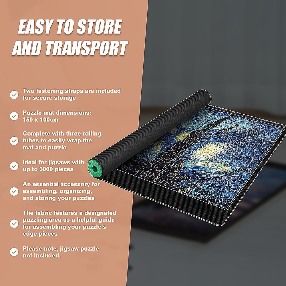 - Includes three rolling tubes for wrapping the mat and puzzle