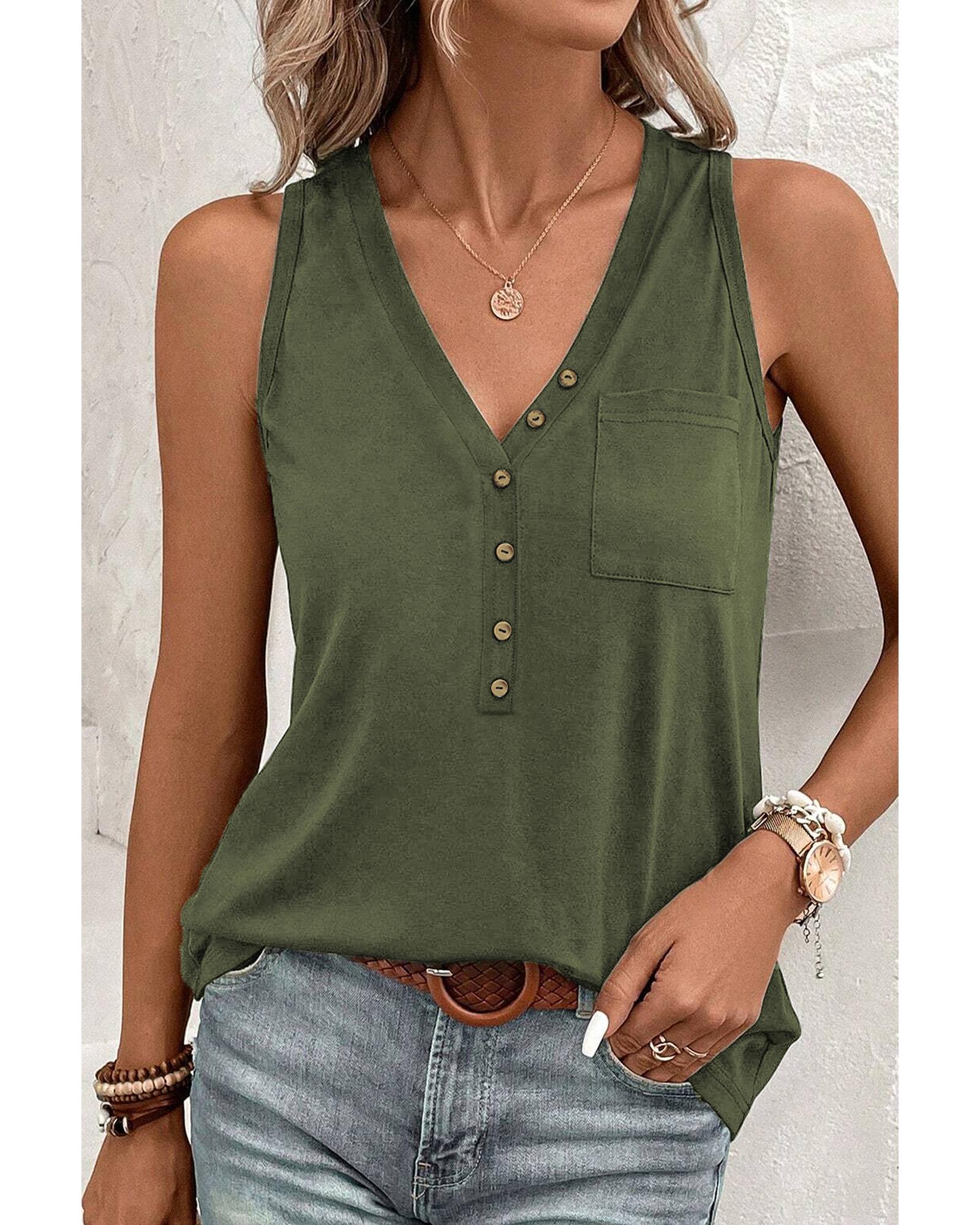 This Jungle Green Half Button V Neck Tank Top features a trendy and chic design, perfect for casual wear. It combines style and comfort with its fashionable details and versatile look, making it suitable for pairing with various bottoms for a stylish outfit.