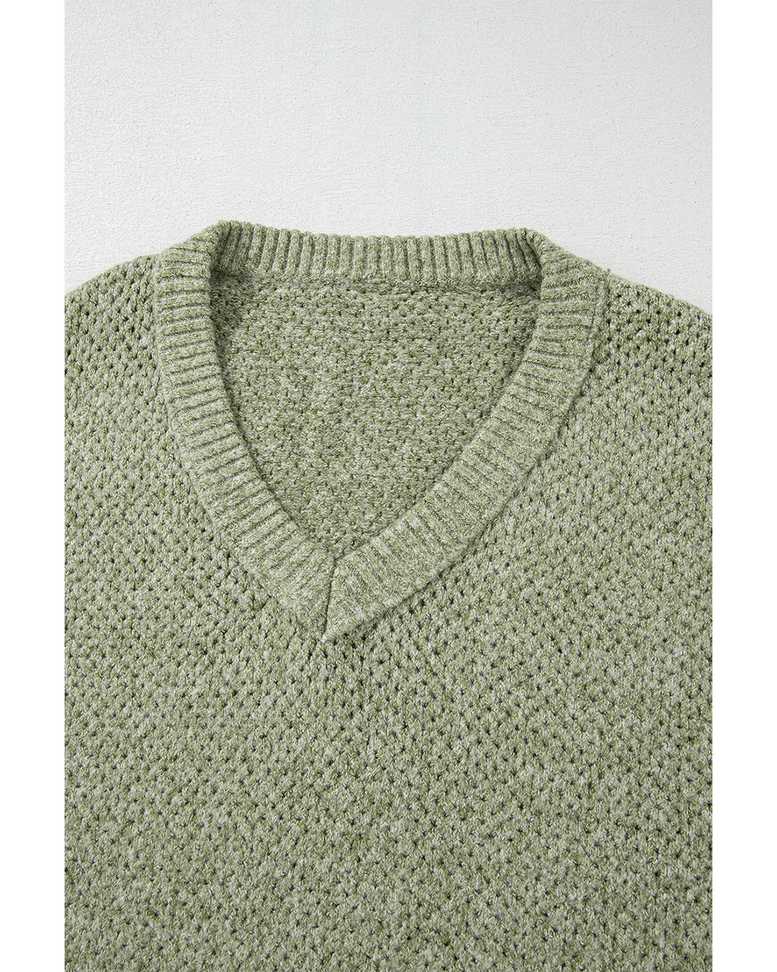 This loose eyelet V-neck sweater in jungle green offers a trendy and relaxed style suitable for everyday wear. Its modern design features eyelet details and a drop shoulder silhouette, creating a fashionable and flattering look. The sweater is crafted from a blend of comfortable and durable materials, making it a versatile addition to your wardrobe.