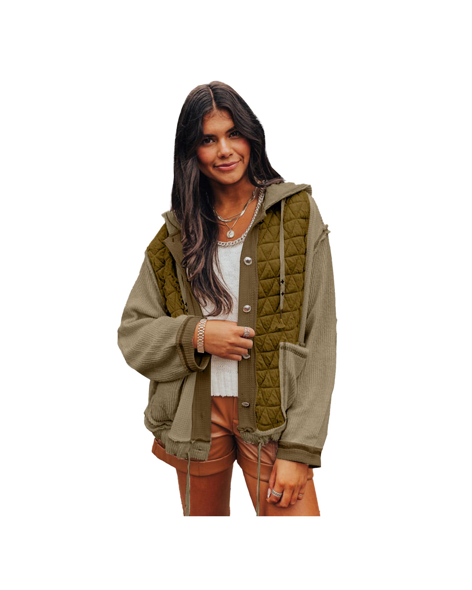 This jacket features a quilted textured patchwork design with a loose fit, offering a cozy and stylish outerwear option. Its textured fabric adds visual interest, making it suitable for casual and trendy looks. The buttoned front allows for easy and adjustable wear, providing both comfort and versatility.