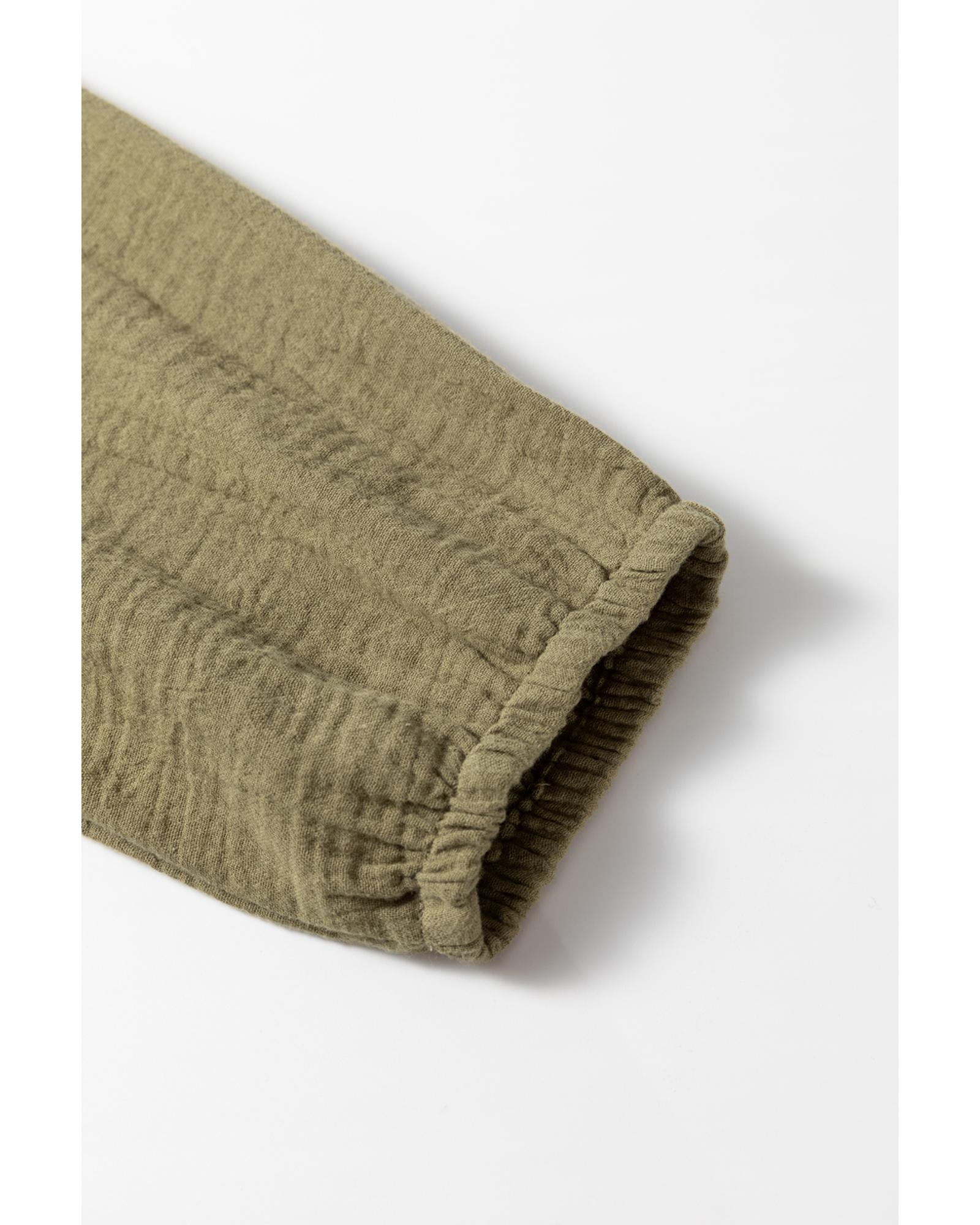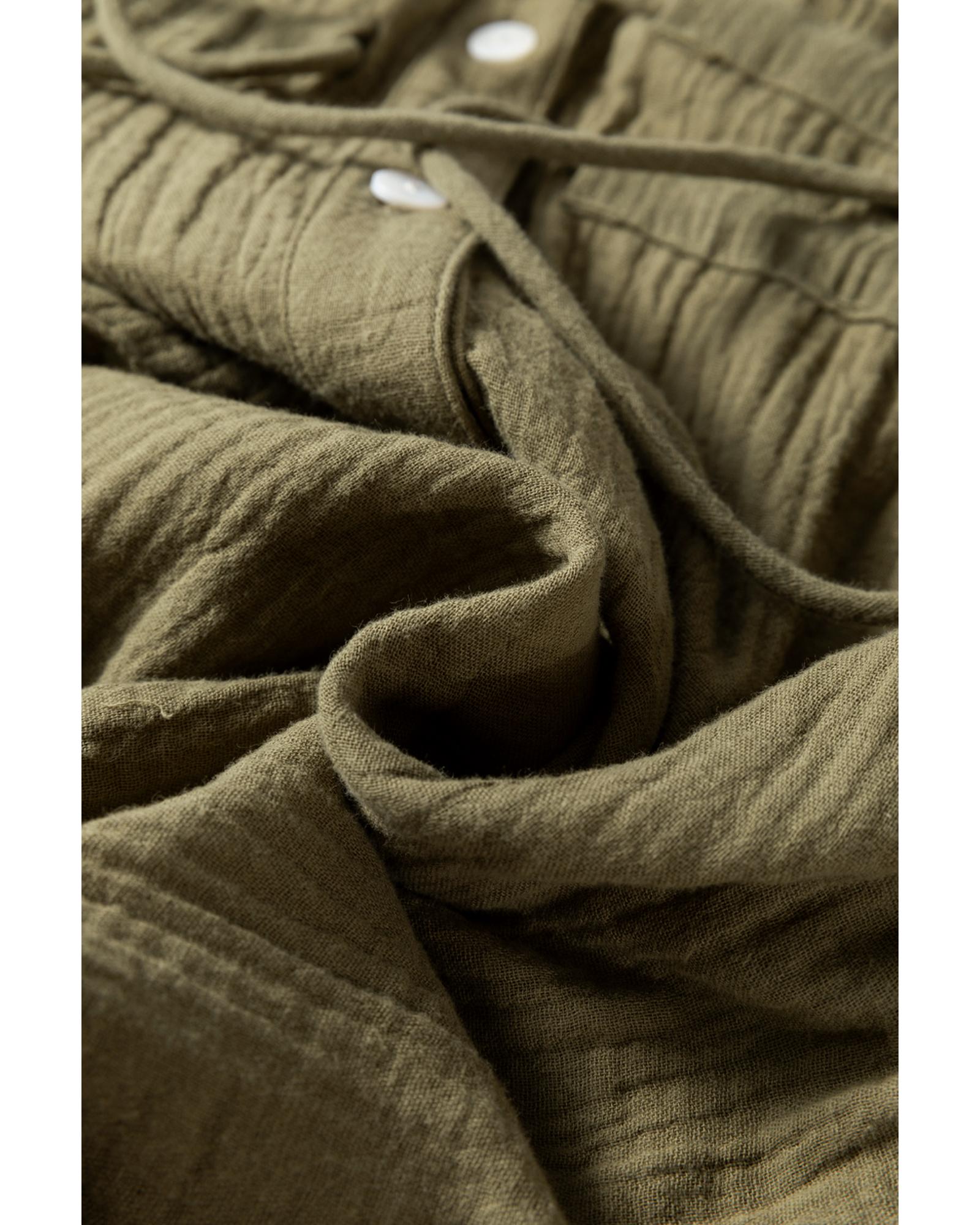 This mini dress features a textured fabric with a stylish jungle green color, designed to create a trendy and fitted silhouette. It combines a collared button-up front with dual ties for a customizable fit, complemented by chic bracelet sleeves that add a feminine and elegant touch.