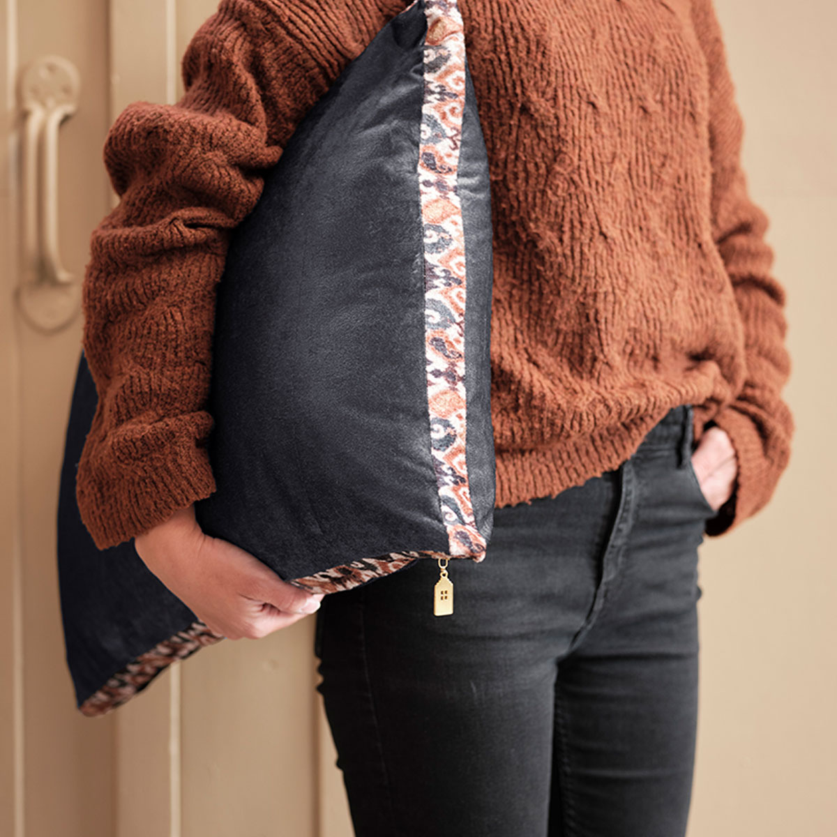 The oblong filled cushion features an elegant velvet design with a vibrant ornamental print in ethnic Ikat motifs, combining modern style with timeless appeal. It is made of high-quality polyester velvet and includes a resilient polyester inner cushion. The cushion has a decorative zipper with a golden puller shaped like an Amsterdam canal house, adding a unique touch. Its versatile size makes it suitable for various interior settings.