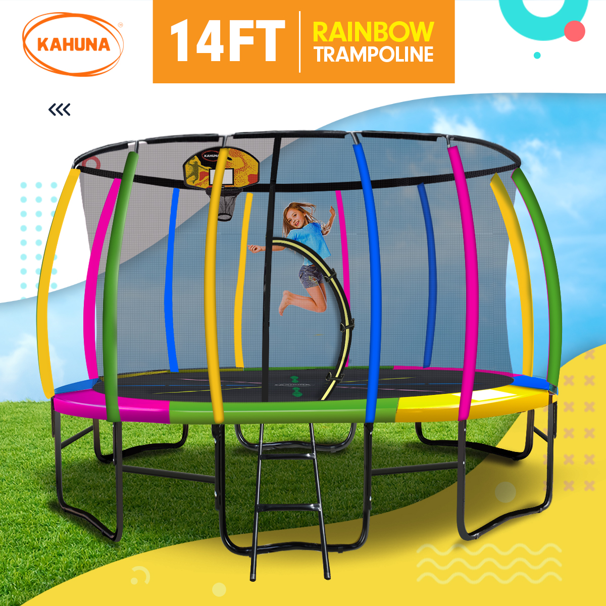 Kahuna 14ft Outdoor Trampoline Kids Children With Safety Enclosure Pad Mat Ladder Basketball Hoop Set – Rainbow