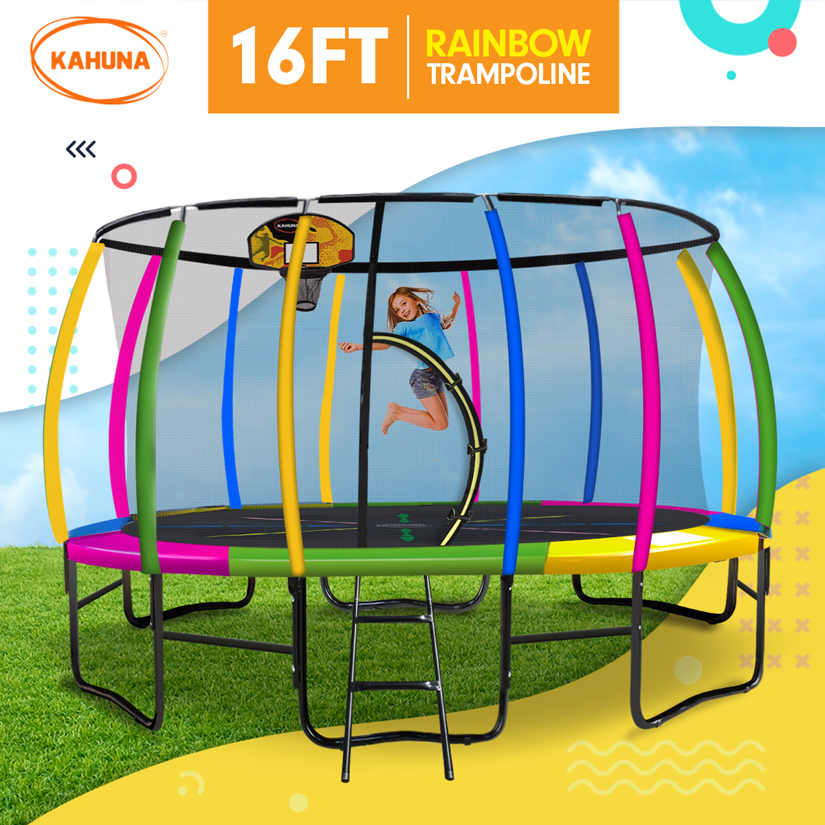 Kahuna 16ft Outdoor Trampoline Kids Children With Safety Enclosure Pad Mat Ladder Basketball Hoop Set – Rainbow