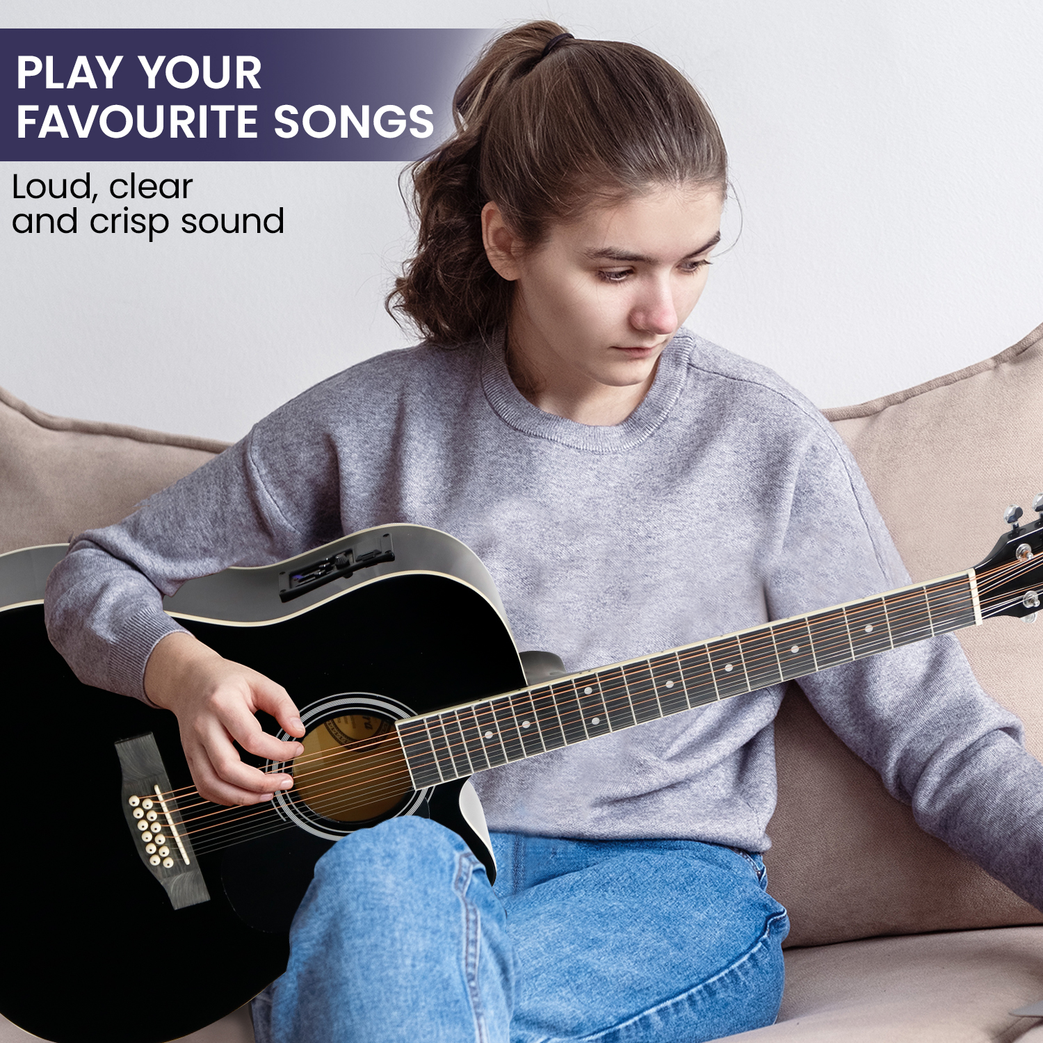 This 12-string acoustic guitar features a wooden body with a high gloss finish, producing clear and crisp sound suitable for singers, songwriters, and casual musicians. Its design includes a fingerboard and cutaway for easy playability and smooth chord transitions. Equipped with a built-in EQ and sealed tuning machine heads, it allows for sound customization and stable tuning. The guitar comes with essential accessories to start playing immediately.