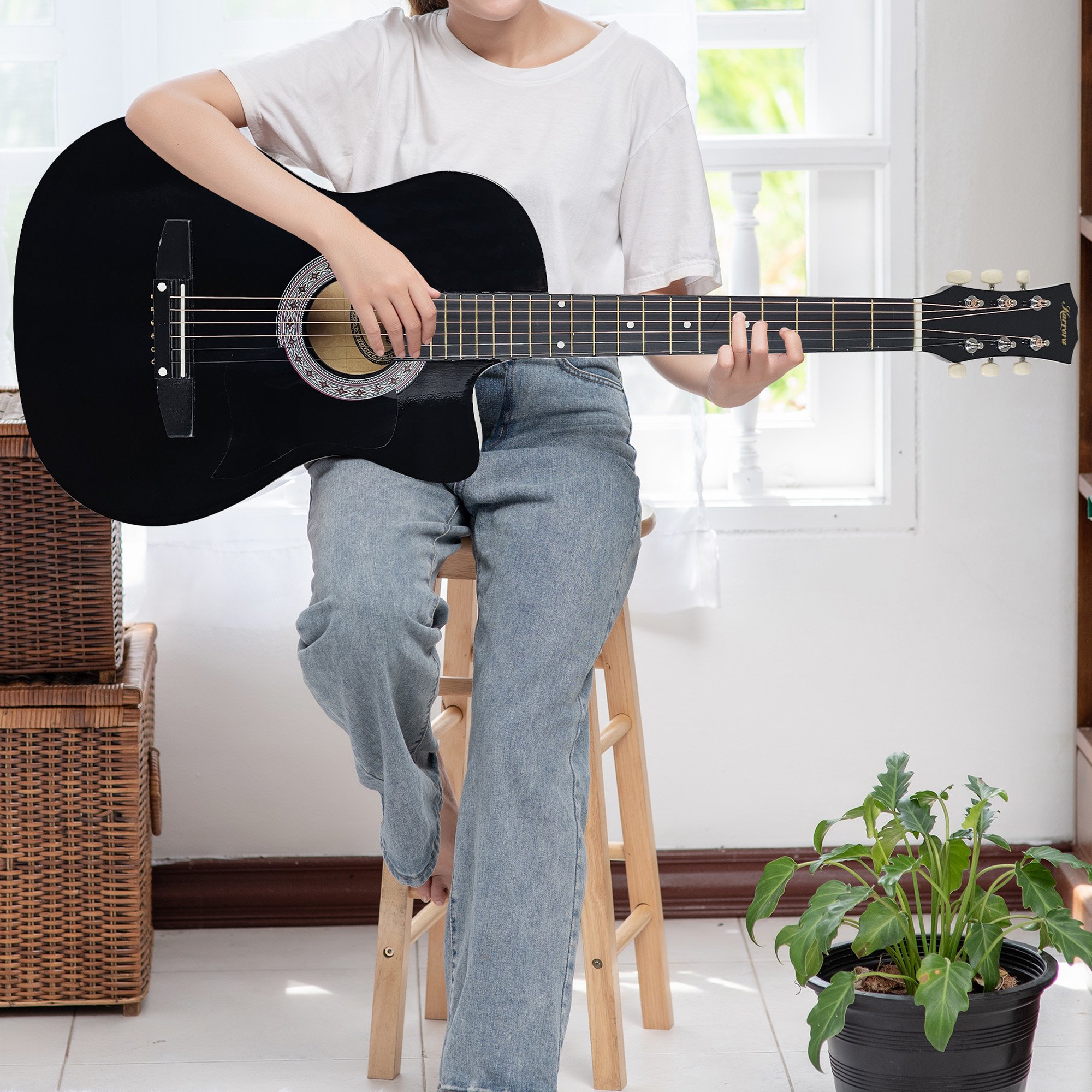 This 38-inch cutaway acoustic guitar is designed for beginner to intermediate players, offering a high-quality build and a polished finish. It provides excellent sound and playability, making it suitable for practice, jamming, or casual performances. The guitar comes with essential accessories to enhance your playing experience.