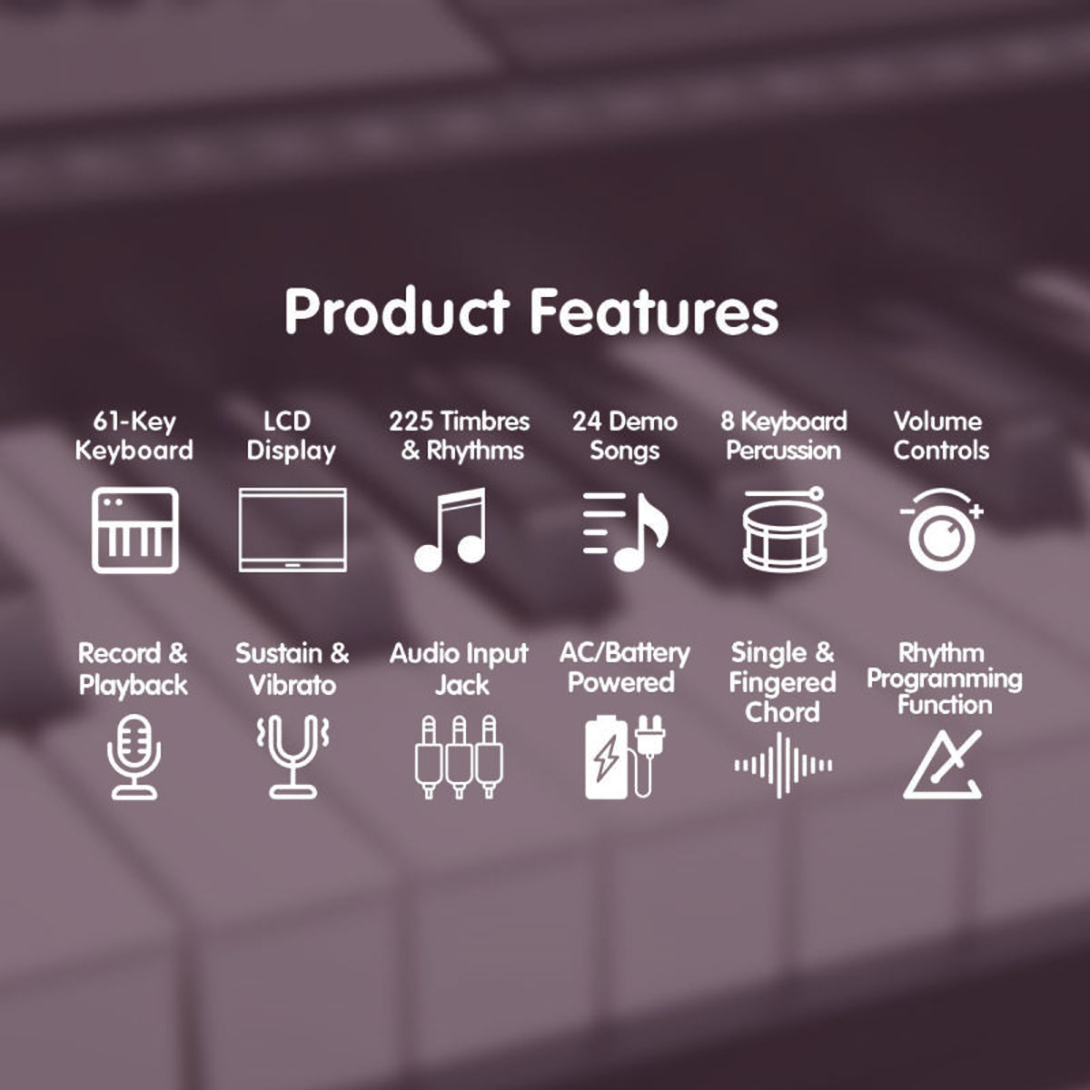 This 61-key electronic keyboard is designed for beginners and intermediate players, offering a wide range of sounds and features to enhance the learning and playing experience. It includes a LED lighting guide and optional key stickers to assist with note memorization. The keyboard is portable and versatile, suitable for practice, performance, and music creation.