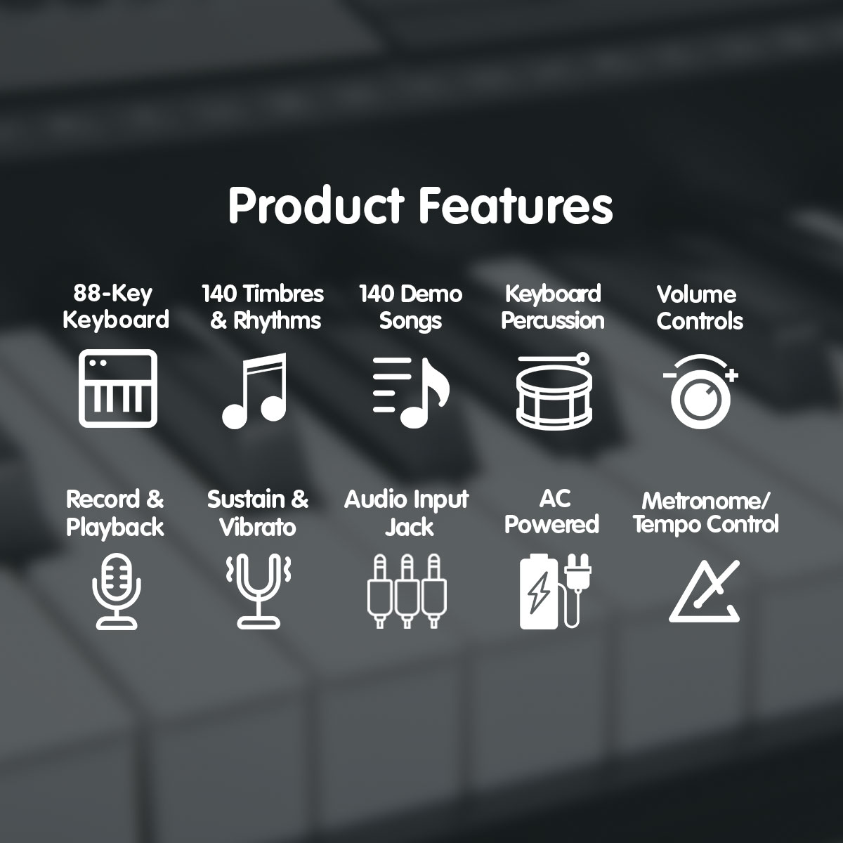 • 140 Timbres including 6 voice direct selection, percussion, and GM timbres