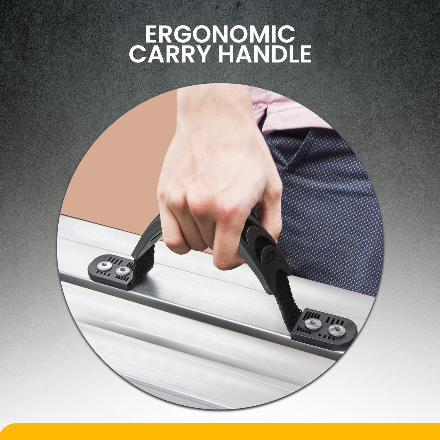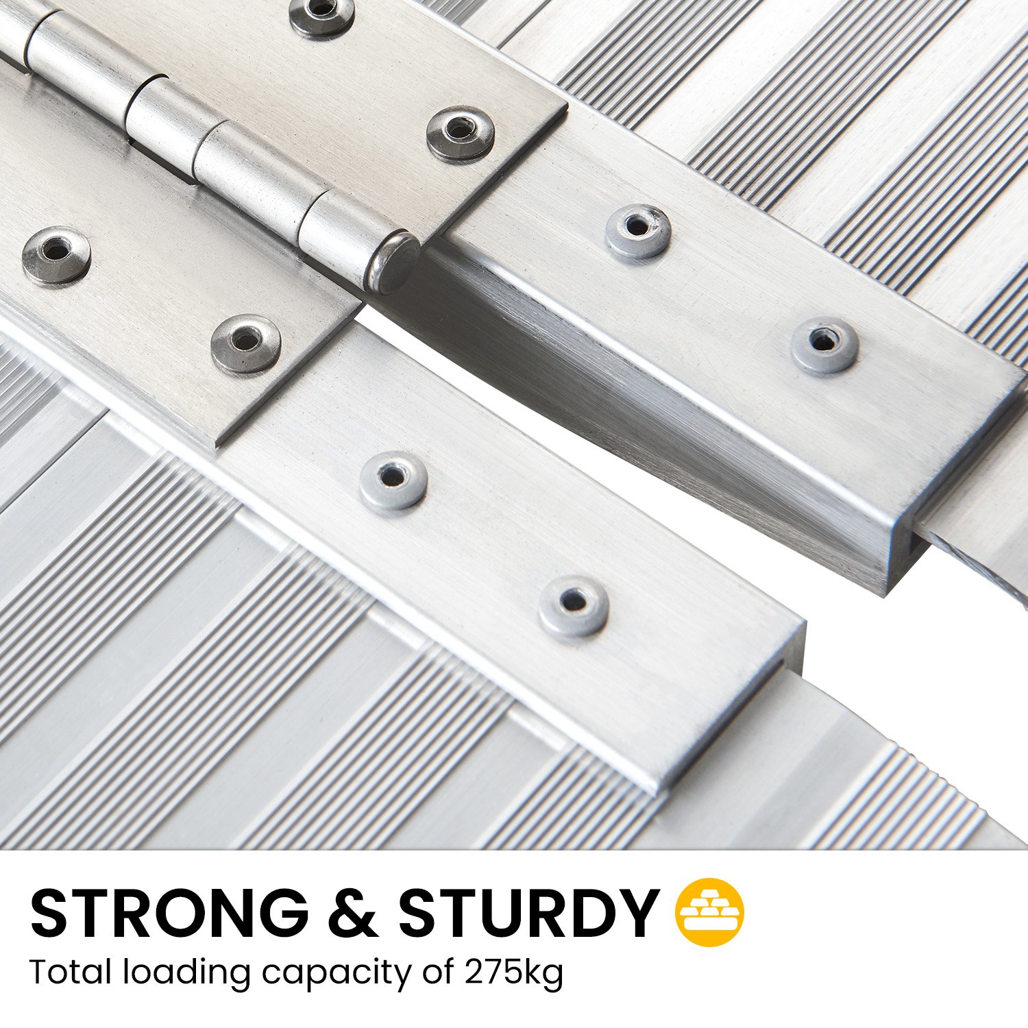 This portable aluminium wheelchair ramp provides a reliable solution for overcoming steps, kerbs, or vehicle entry. Its four-way folding design allows for easy transportation, storage, and versatile use both outdoors and at home. Constructed from high-strength aluminium, it offers durability and safety for users with a maximum load capacity of 275kg. The non-slip surface and safety guardrails enhance stability and security during use. Additionally, a locking pin is included for added convenience.